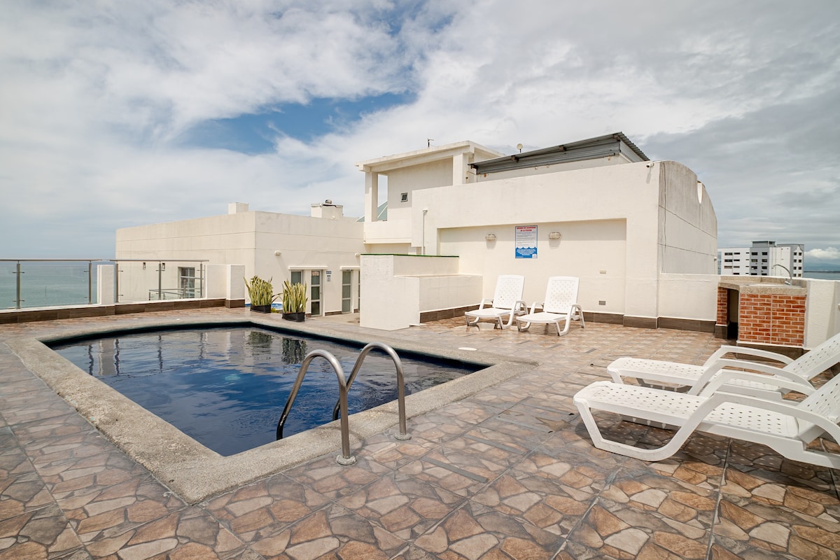 Enjoy a comfortable stay in this fully equipped 2 bed, 2 bath apartment, ideal for families or small groups. It has a queen bed, 2 full beds, 1 sofa bed, 2 modern bathrooms, kitchen equipped with American bar, stove, microwave, big fridge, closets, high-speed WiFi, 4K Smart TV and private parking AMENITIES COMPARTIDOS Full access to the Rooftop, pool, jacuzzi, fire pit and bbq overlooking the ocean.