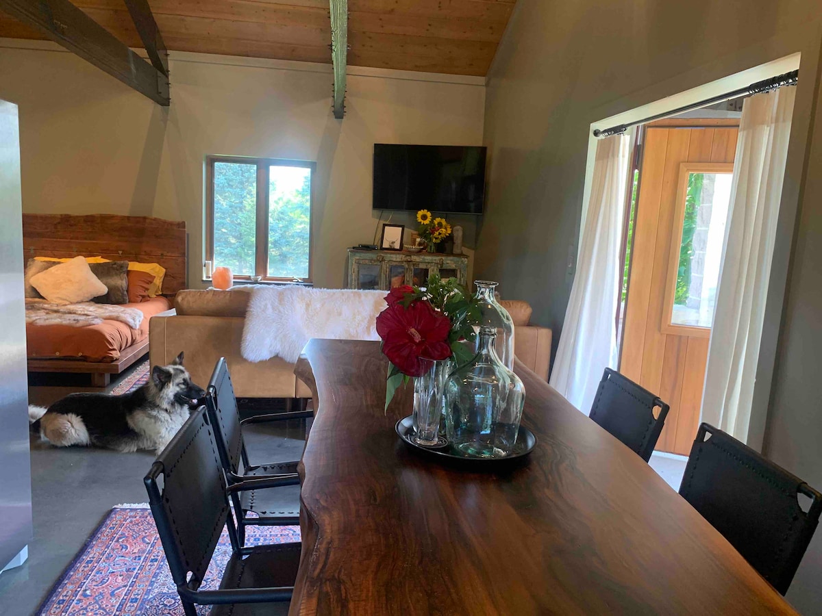Large private 2nd floor studio style living area with queen size bed, couch, table/chairs, TV, refrigerator, microwave, hot plate, NO OVEN OR STOVE TOP, sink, large shower, A/C, heat, washer and dryer, and deck. Wifi internet is provided. The television has Netflix. No cable channels. The furnace is nontraditional. It is not located in a closet. The noise when running and starting will be louder than normal during winter months. Ear plugs are available for those that are noise sensitive.