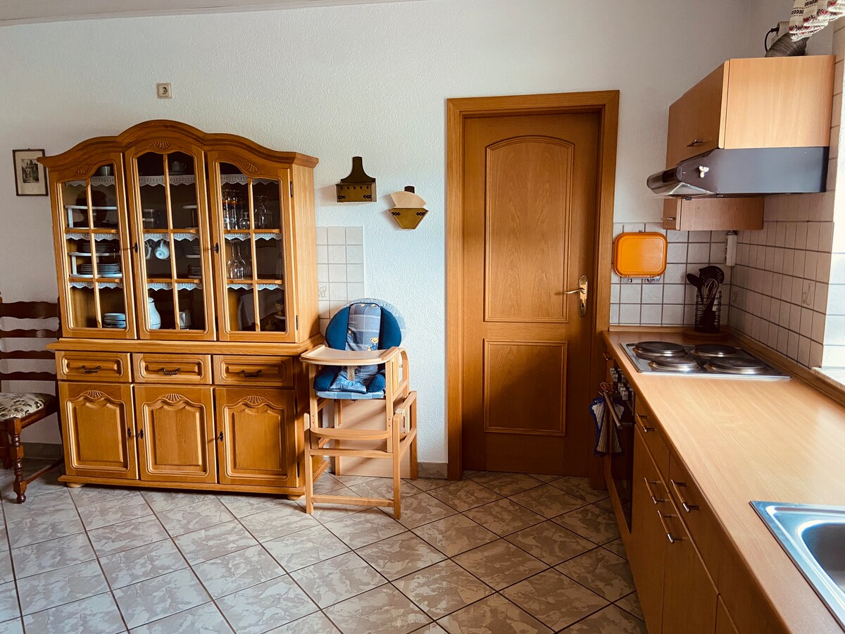 Detached country house in meadows and forests in an absolutely secluded location. Hiking/biking trails start right by the house. There is a great covered barbecue with fireplace. The beautiful garden can be used in many ways. A ping-pong table, a foosball table and a dartboard are in the double garage and offer fun in any weather. The beautiful antique country house style immediately invites you to relax. The kitchen is well equipped. Outside of the holidays, we can often extend the check-in/out.