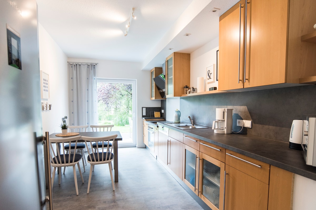Welcome, dear prospective guest! A freshly renovated apartment awaits you. The picturesque house has a large garden with cozy corners for barbecuing, relaxing & unwinding. In the garden, a cozy sauna with pool can be used. Children can and are allowed to live out their natural urge to move and play. Parents, of course, too. Alternatively, relaxing walks or excursions (e.g. canoe trips on the Lahn) are possible. The university town of Gießen is around the corner!