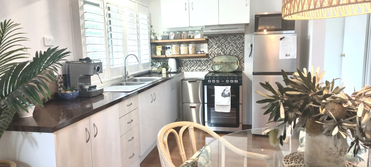 A peaceful studio, with cosy woodfire on a bushy acre, down a quiet lane, close to Ocean Grove beach, village and Nature Reserve. A low eco-impact getaway: all electric, solar powered, ethical firewood etc. Spaciously well designed, with a welcoming vibe, offering: a full kitchen, breakfast, private garden, split system aircon, smart TV, Wifi and bikes.