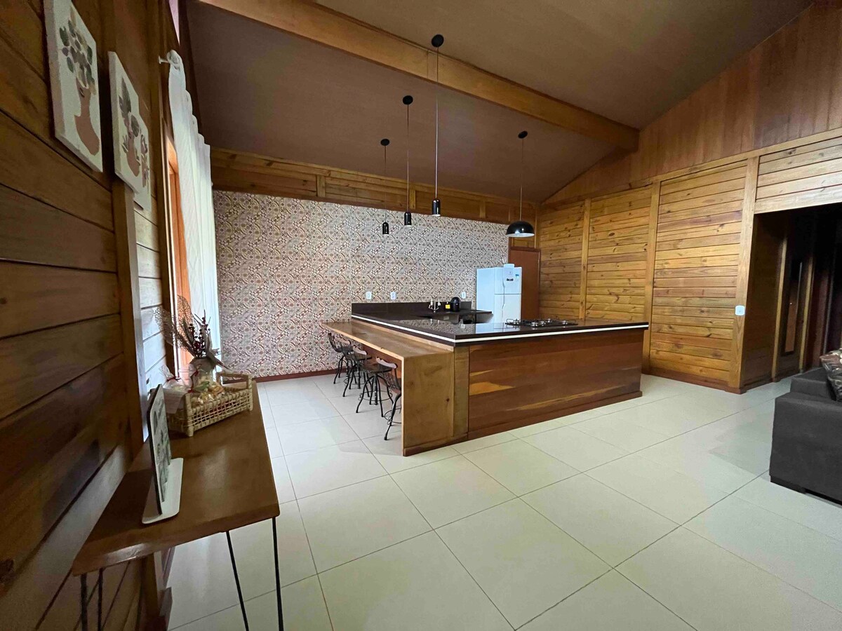 Excellent house in the center of Domingos Martins. Perfect for families with children. Large backyard, covered garage, kitchen, barbecue area, outdoor shower, 3 bedrooms, two of which are en-suites with a double bed and the other with a double bed, social bathroom, full laundry. In the living room there is the possibility of using a sofa bed (2 seats). Bed and bath linens are not included. Toys for children are available. Pets are allowed and it has a fully fenced space.