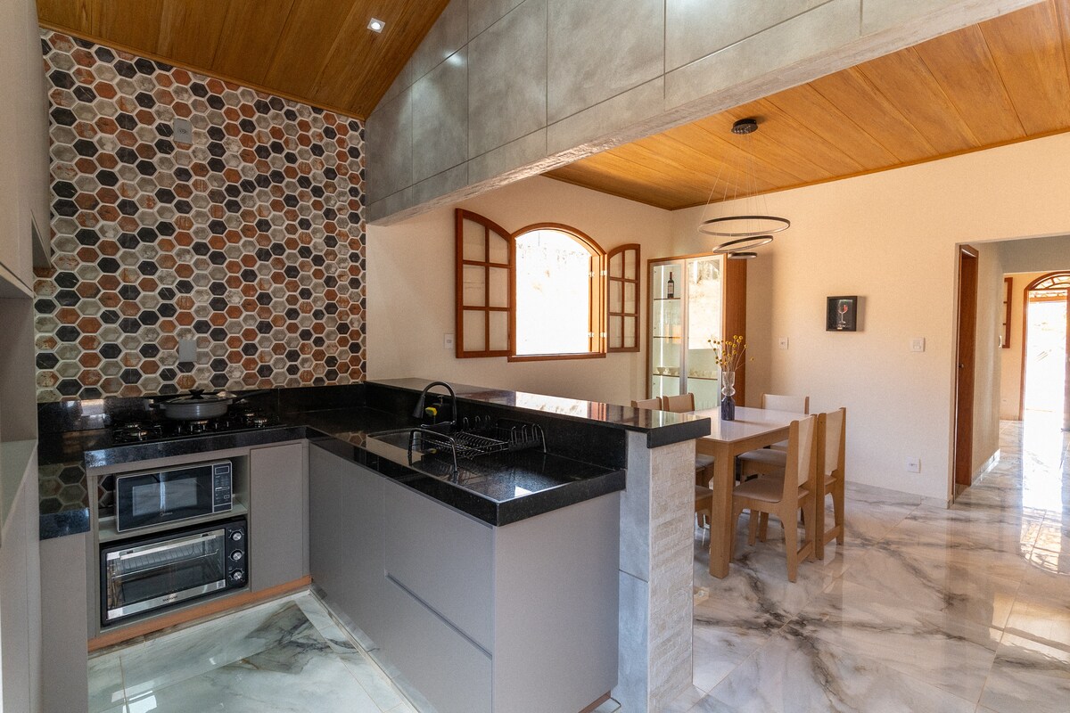 Newly built house, modern architecture, airy, illuminated, clear environments, glazed room creating a total integration with the surrounding nature and making it possible to enjoy the view of the mountain, the valley and the sunset, lighting project that provides an atmosphere of comfort, gourmet area with beautiful view. A house that offers all the amenities for a proper and comfortable operation. Inside the Retiro do Chalé Condominium, lots of security, comfort and nature, 31 km from Inhotim.
