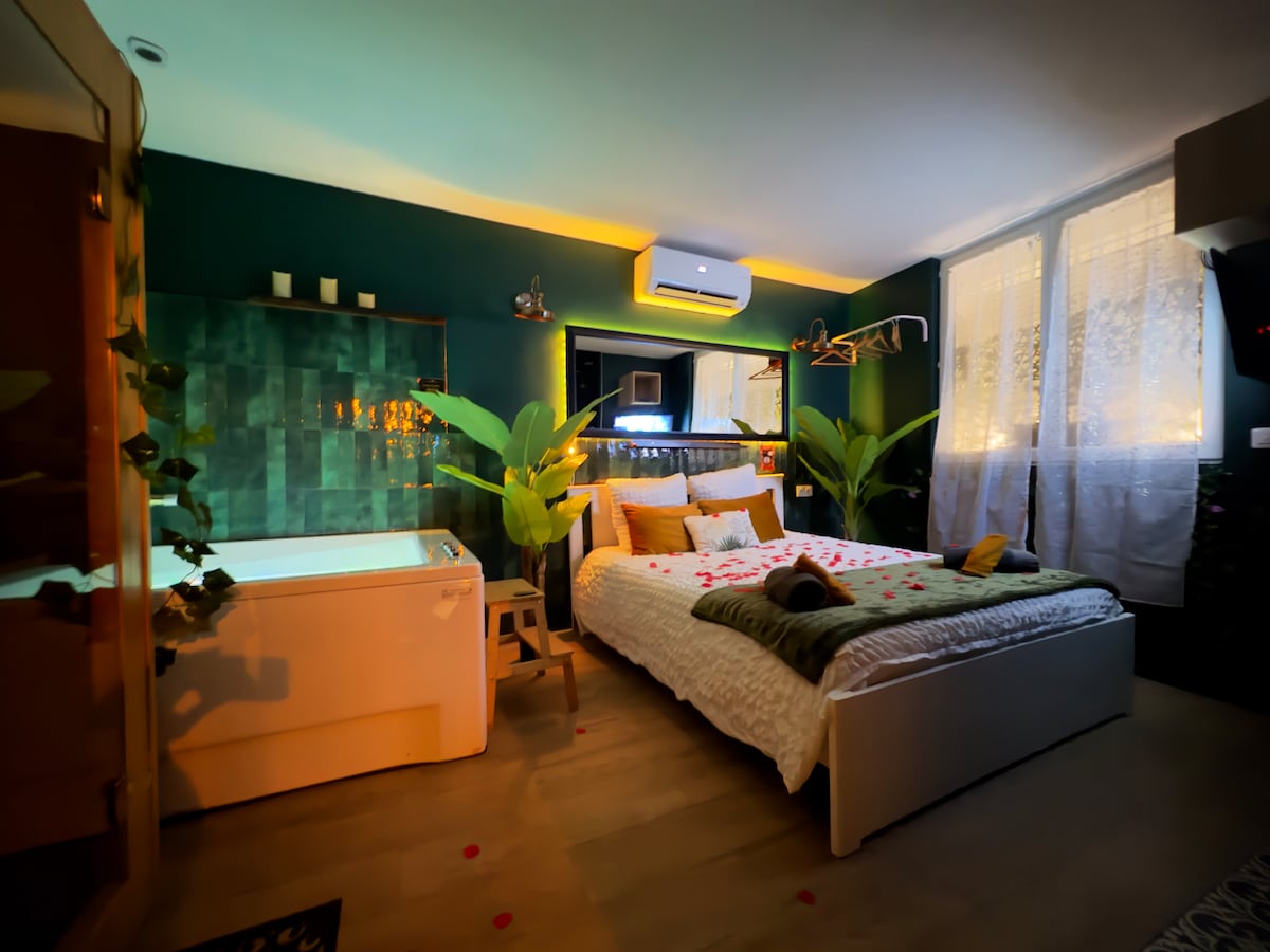 The Antigua suite is a natural setting, an extraordinary decor unique in Marseille with its cave where you will discover its private SPA pool with bubble bench and integrated waterfall. In this 70m2 suite you will also have an infrared sauna for total relaxation. It will be available to you bath towels, shower gel/shampoo and a hair dryer. The Antigua suite is equipped with 2 TV screens, air conditioning/heating, wifi.