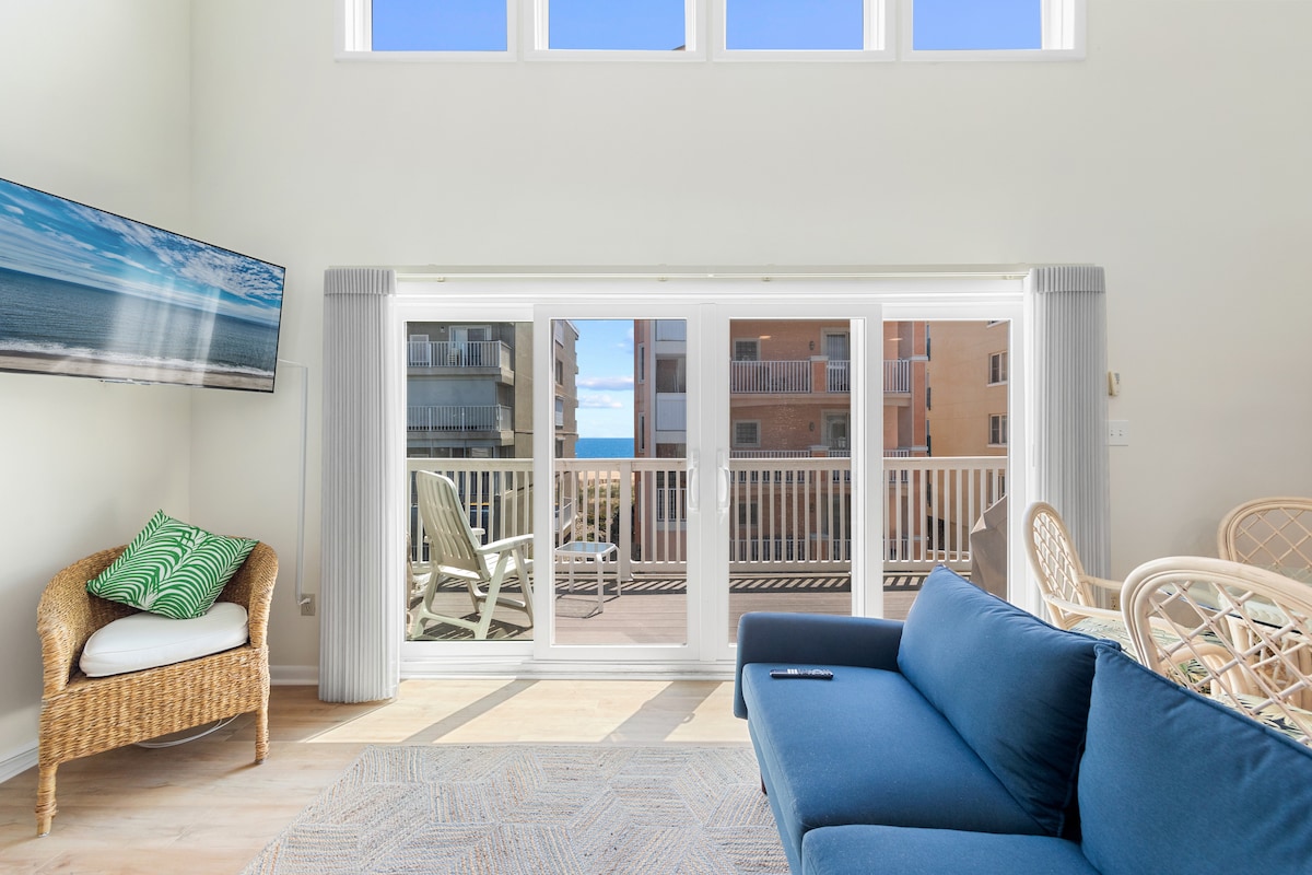 Retreat to this stylish ocean block getaway, perfect for two. Unwind in this beautifully decorated space and enjoy breathtaking ocean views from the front door. This renovated unit features brand new appliances, washer/dryer and 65” TV. This rental is located in North Ocean City and is only a 3-minute walk to the beach and nearby attractions (including mini-golf, restaurants and bars). Located on the third floor, this unit offers free parking behind the building, cable and high speed WiFi.