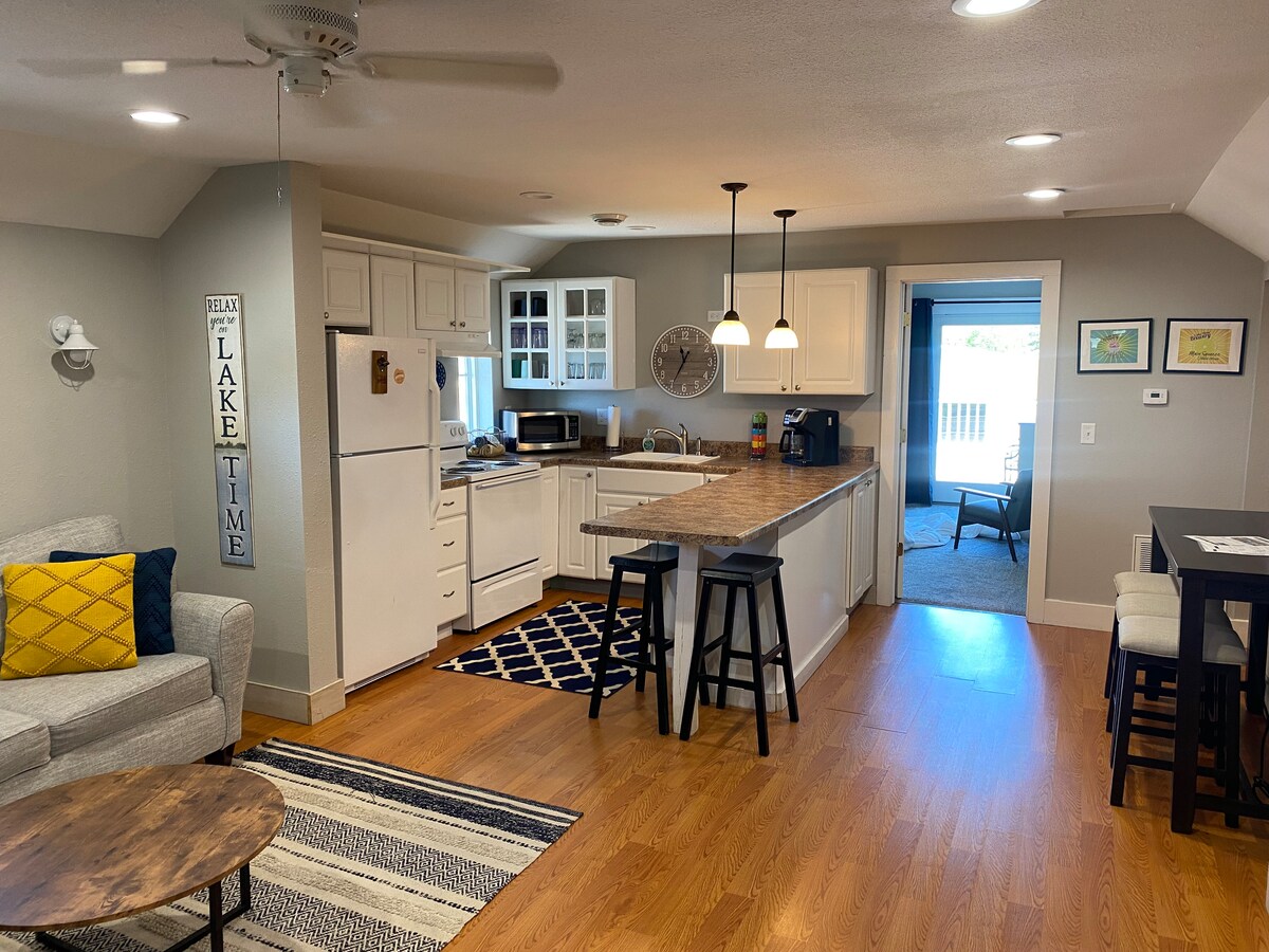 Cozy apartment 1 block from a public lake access. Large front covered deck with welcoming view of the lake. 2 bedrooms, one with queen pillow top bed. The second a double and a single bed. Modern bathroom. Large living with comfy seating. Cozy kitchen for meal prep, fully equipped with a full array of dishes, pot and pans. Just shop a couple blocks away for your own needs. Basic staple items also on hand. Internet available for your work and pleasure web browsing. Local channels not available.