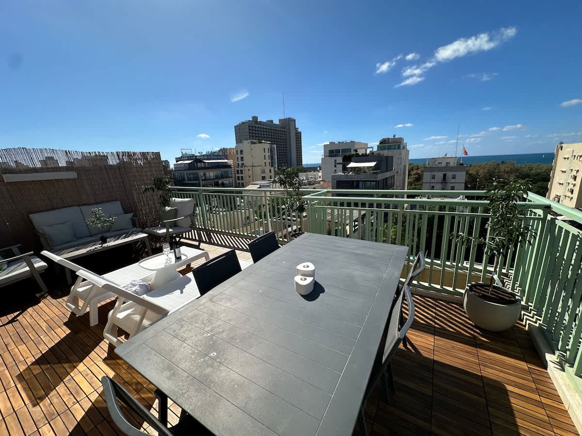 Welcome to our stunning renovated penthouse nestled in the heart of TLV, mere moments from the shimmering beach. Occupying the top floor of a meticulously preserved Bauhaus building, this apartment offers an unbeatable blend of historic charm and modern. a world of sophisticated elegance as soon as you open the door. The highend interior design of this penthouse pays homage to the Bauhaus style,The spacious, open layout creates an inviting atmosphere, perfect for relaxation or entertainment
