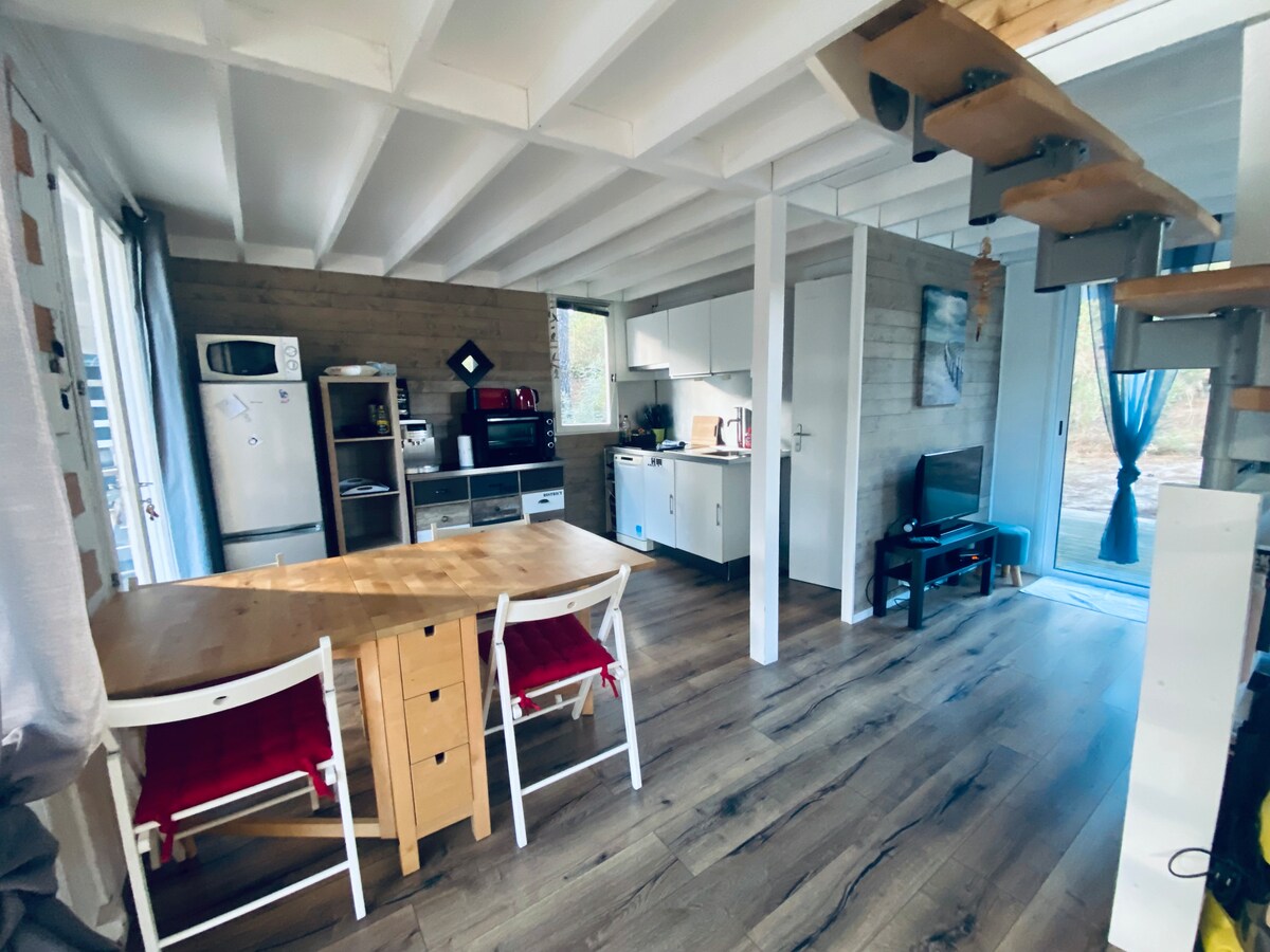 Small slice of natural paradise. It's a simple and charming place, perfect for enjoying the beautiful days. With a large garden, a covered outdoor lounge and a summer kitchen in the shade of the trees. 12 km from the beaches (ocean and lake), 15 km from the Arcachon Bay, 3 km from the shops, you will be ideally located. Old mobile home transformed into a 40 m2 wooden chalet with a 50 m2 terrace. Artisanal and ecological construction, here it's dry toilets and a relaxing spirit! Ideal for families.