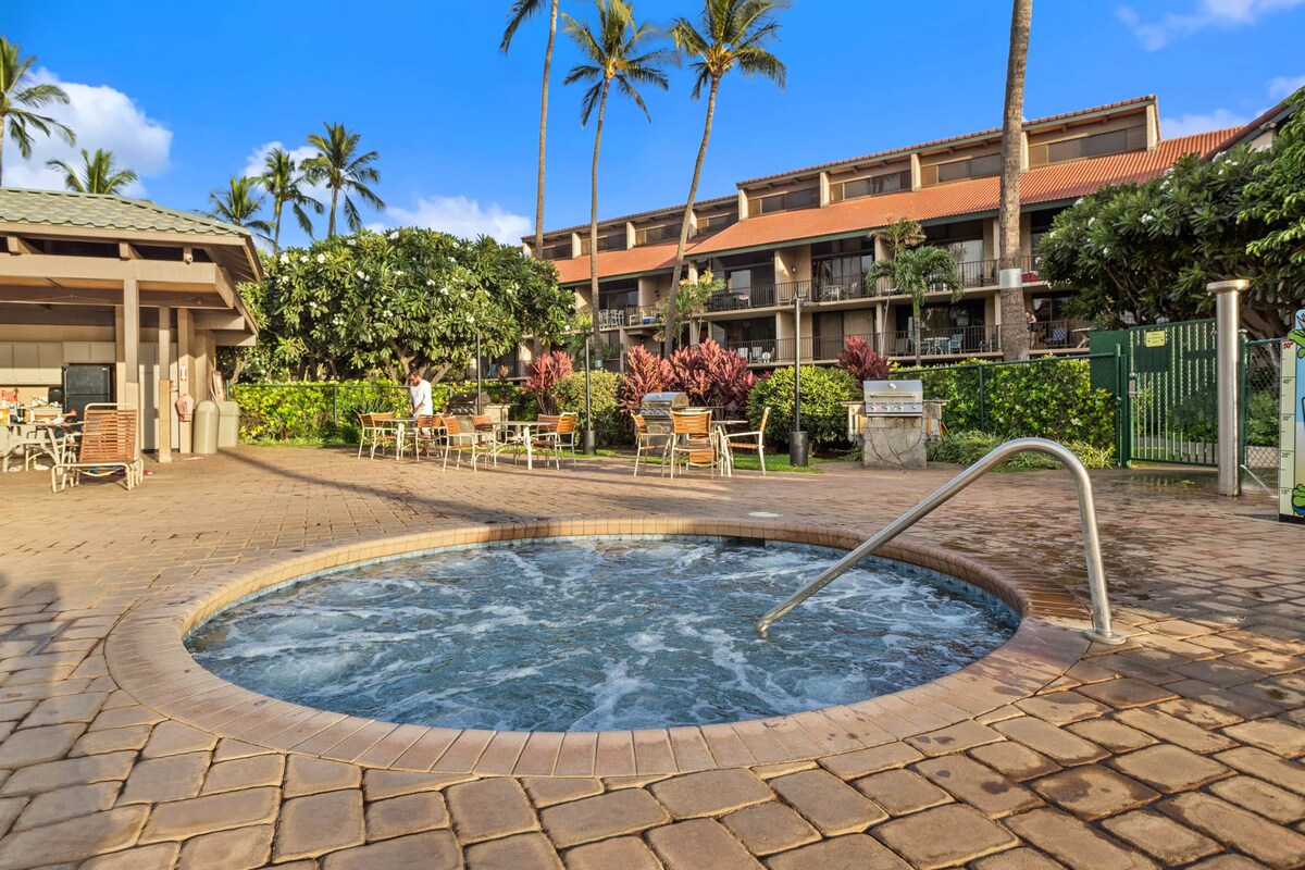 Enjoy the massive view-ocean and 2 Islands-billowy clouds and WHALES in season from your large, 150 square ft PRIVATE lanai and 900 square ft condo. A 4 minute walk to Kamaole 1, (Kam 1) a world class beach offering snorkeling, SUP, and boogie boarding, with gear rentals steps away. 3-15 mins walk to all S Kihei’s restaurants, food trucks, shops and bars, it's beach town life just down the driveway. Heated swimming pool, hot tub, sauna, and 2 BBQ areas! No more than 4 adults and 2 kids.