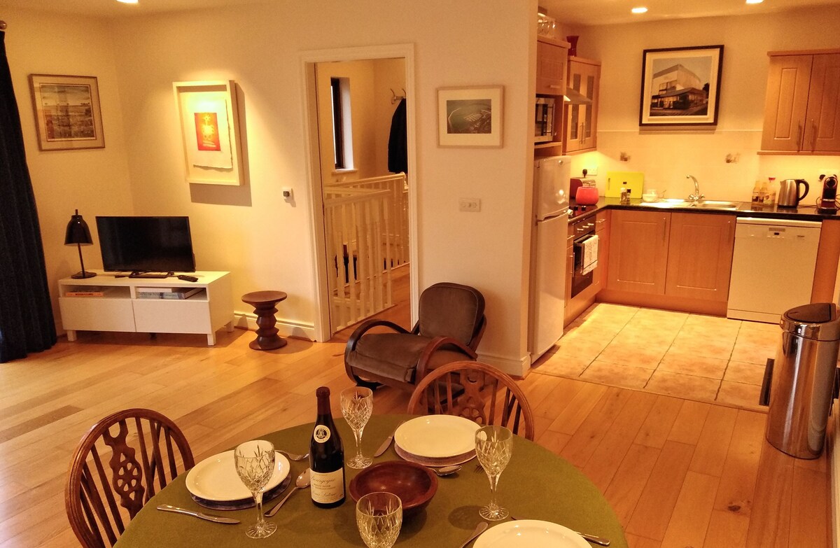 Town centre Standard set up 2 Dble bedrooms. 2 Dble mattresses available if needed. Beside car park(not free but cheap) Kitchen/Living room & separate sitting room Rooftop apt, outside patio suitable for children/sitting out/storing bikes Overlooking Bridge St 1 min walk to shops/pubs/restaurants Travel cot (on request) Cable TV Superfast Wifi Must climb 2 flights of stairs Noise from the street due to central location