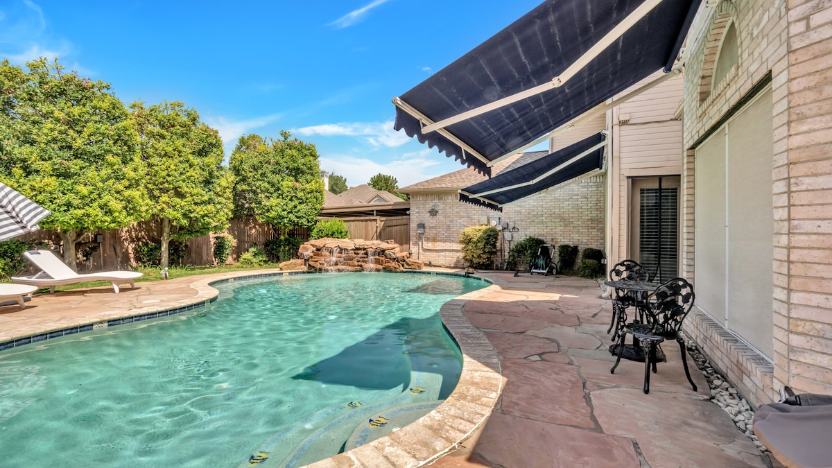Charming home in the heart of Frisco. Super clean inside & outside with a relaxing heated pool, spa, oversized living room, game room, outdoor patio & firepit for you to experience lovely Texas living! Patio furniture, lounge chairs & a BBQ grill are available in the backyard. We have lots of pool toys, board games, Pool table & toys for the whole family to enjoy. The home is connected with high speed internet & TV. No checkout chores ,enjoy your stay, not spend your last morning cleaning.