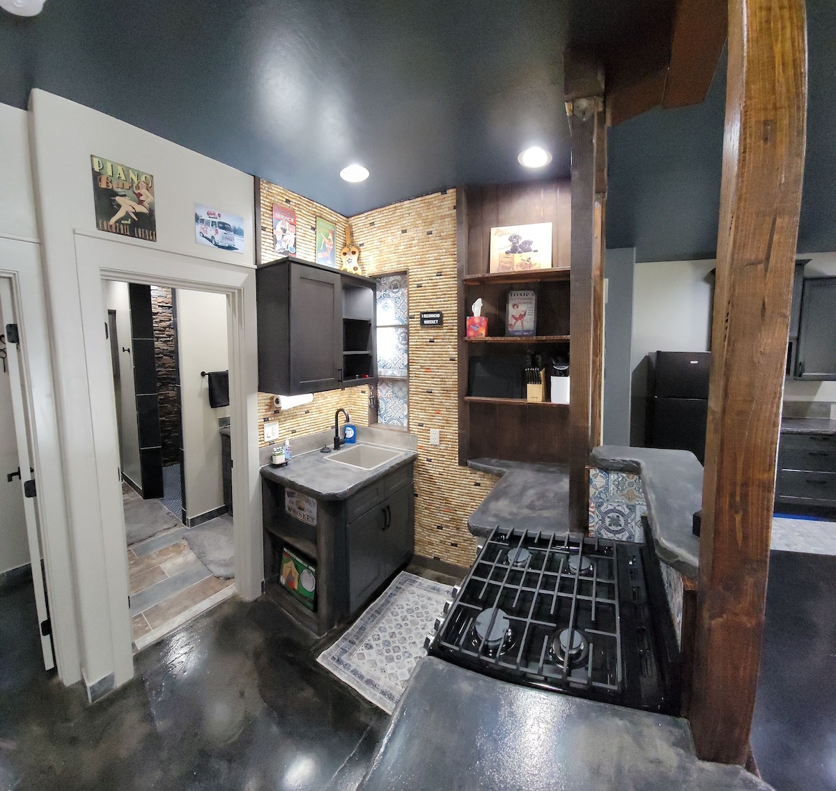 Take it easy at this unique & charming getaway in Pinetop. Secluded & comfortable, indoors & out. Full kitchen amenities and laundry, plus outdoor lawn area & easy parking. Leave the tension behind and enjoy the stress-free environment up in the cool pines! Enjoy the views of the trees and sunsets from this space! 1 bedroom w/ queen bed. Nice comfortable & oversized sectional Couch. Wifi & Smart TV. Tap water is very good here. *During winter weather 4x4 usually required