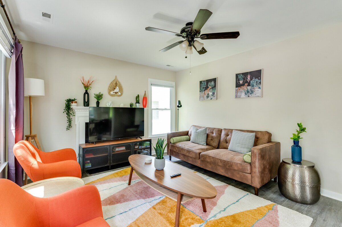 Welcome to the Yellow Tiger’s Den, a private, tucked-away guesthouse filled with bold color, thoughtful design, and a little Richmond edge. Set above a spiral staircase for total privacy, this sunny studio blends mid-century modern style with curated yellow accents, a cozy private patio, and everything you need for a relaxed stay. Located in Richmond’s historic Battery Park neighborhood, you’re minutes from the city’s growing food scene, local attractions, and easy highway access.