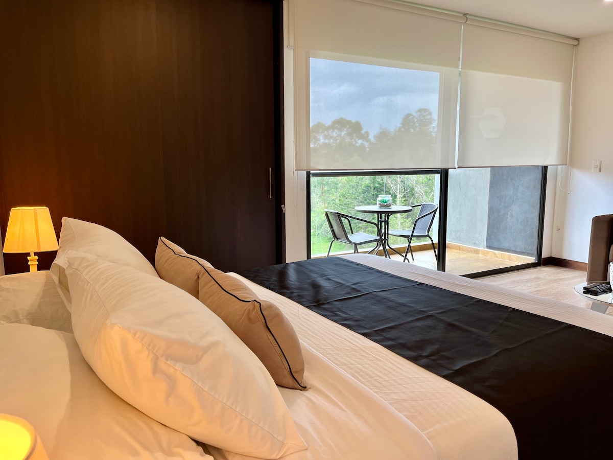Con un amplio espacio de 23m2, cuenta con una acogedora alcoba, una zona de entretenimento perfecta para relajarte, un balcón para disfrutar de una espléndida vista, cocina equipada, un cómodo escritorio para trabajar; amplio vestier para organizar tus pertenencias, lencería de calidad y un baño completo para tu comodidad. Cuenta con cajilla de seguridad, plancha y mesa para planchado.