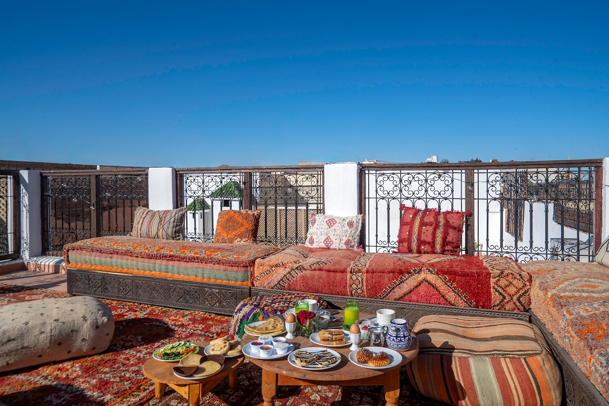 The Scheherazade Suite. Escape to a charming boutique hotel riad in the heart of the Medina, just a short walk from Jemaa El Fna Square. Immerse yourself in pure Marrakchi tradition, with elegant decor, air-conditioned rooms, fast WiFi, and a refreshing plunge pool. Enjoy daily breakfast & housekeeping, plus a stunning rooftop terrace for evening drinks and dinner under the stars. A peaceful retreat with all modern comforts—book your authentic Marrakech experience today!