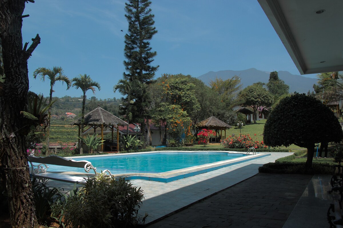 Relax, unwind, or even working. This tiny villa is a place for all. Nestled in the feet of Mount Salak overviewing Mount Pangrango and our own garden. Your solution for short getaway from city's hustle, 70 minutes away from Jakarta. *Fasilitas:* 1. Swimming Pool (Ubud's-like View) 2. Balcony (Gunung Pangrango + Sunrise View) 3. Board games (catur, uno, stacko, etc) 4. TV Netflix Youtube 5. Wifi up to 5Mbps 6. Gardens 7. Kitchen 8. Viewing Deck