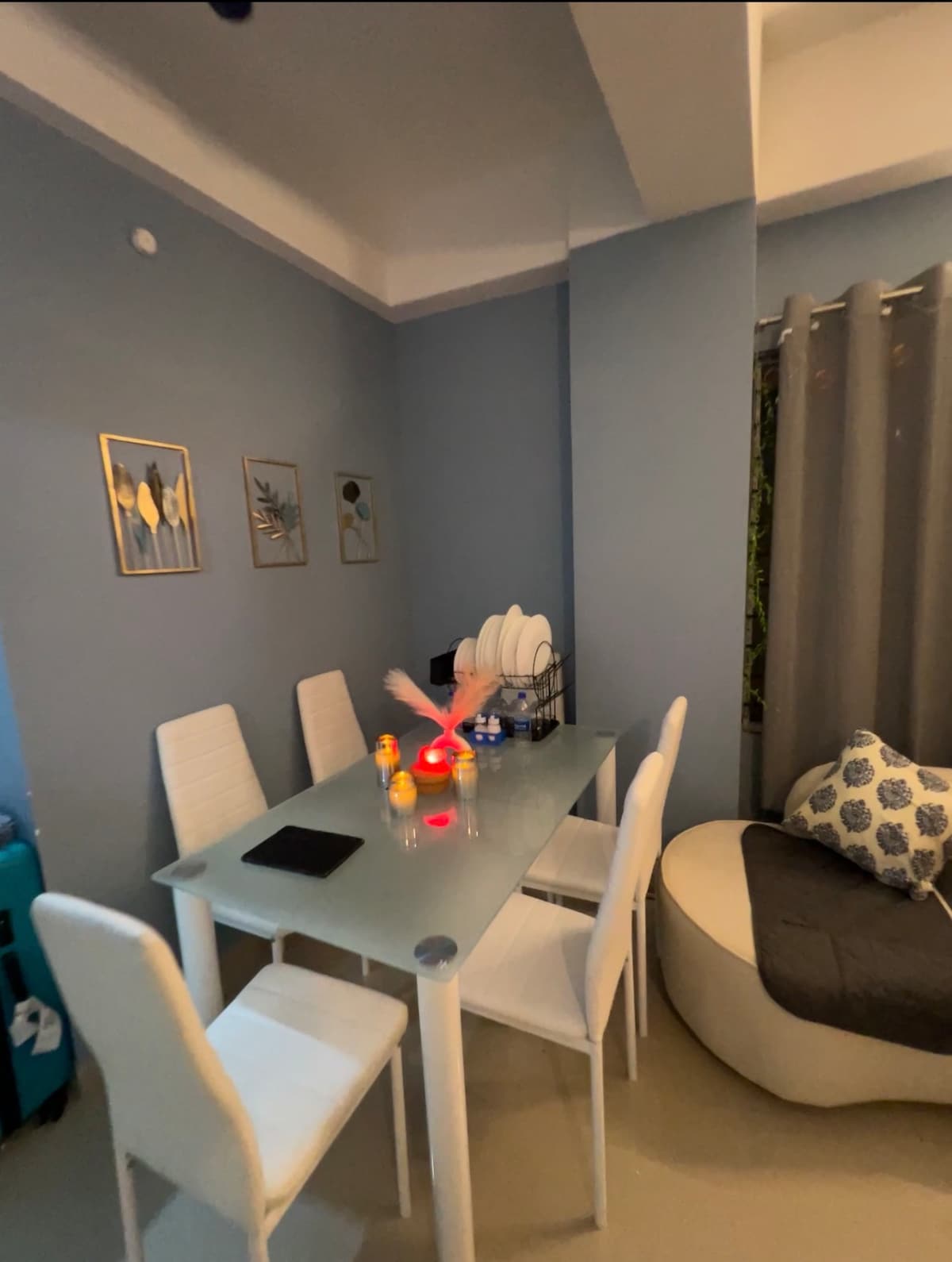Relax in our Carebnb stylish boho-chic apartment with a plush king bed, cozy sofa cum queen bed for 2, full kitchen, and a cute bathroom. Enjoy AC, Wi-Fi, smart TV, balcony, and private parking. The master bedroom offers a king-sized bed for 2, layered with premium linens, warm lighting and a cozy recessed window cove. Cook like a pro in the fully stocked kitchen, complete with a real wood dining table set and eco-friendly, biodegradable tableware—a mindful touch for sustainable travelers.