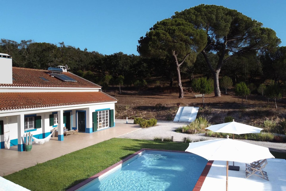 Escape to a luxurious holiday home in Alentejo, Portugal, on a 15-hectare estate surrounded by cork and umbrella pine trees. This traditional Alentejo-style house, with its iconic blue-and-white colours, offers tranquillity and charm. Wake up to the gentle sounds of nature and distant church bells. A 15-minute walk from the charming town of Melides, it’s the perfect retreat for relaxation, privacy, and unforgettable moments in a serene setting.