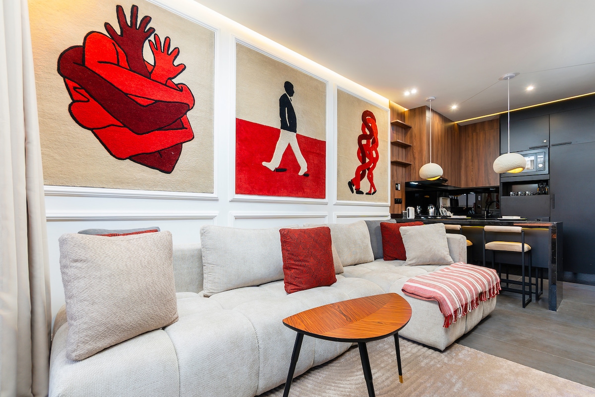 Immersive experience in a contemporary apartment-gallery. Perfectly located in the festive Golden Triangle, 15 min walk from the medina. This very high-end 140m2 bright and cozy apartment. Close to the iconic palaces (Mamounia, Sofitel, Casino) Prestige residence with swimming pool. Ideal for up to 5 guests, it offers 2 bedrooms, 3 terraces, 2 bathrooms and 3 toilets. With a trendy and lively atmosphere, a unique experience in the heart of Marrakech awaits you.