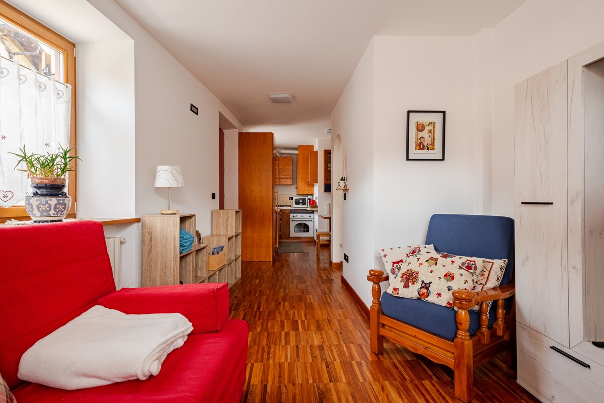 This accommodation is part of a traditional "maso", the old Alpine farmhouse, which has just been renovated. Positioned on the top floor, it reveals a panorama of serene woods, two tranquil mountain lakes, and the majestic Brenta Dolomites. Inside, the charm of pine wood, the enveloping warmth emitted by the wood stove, and subtle decorations complete the welcoming atmosphere of a modern mountain retreat.