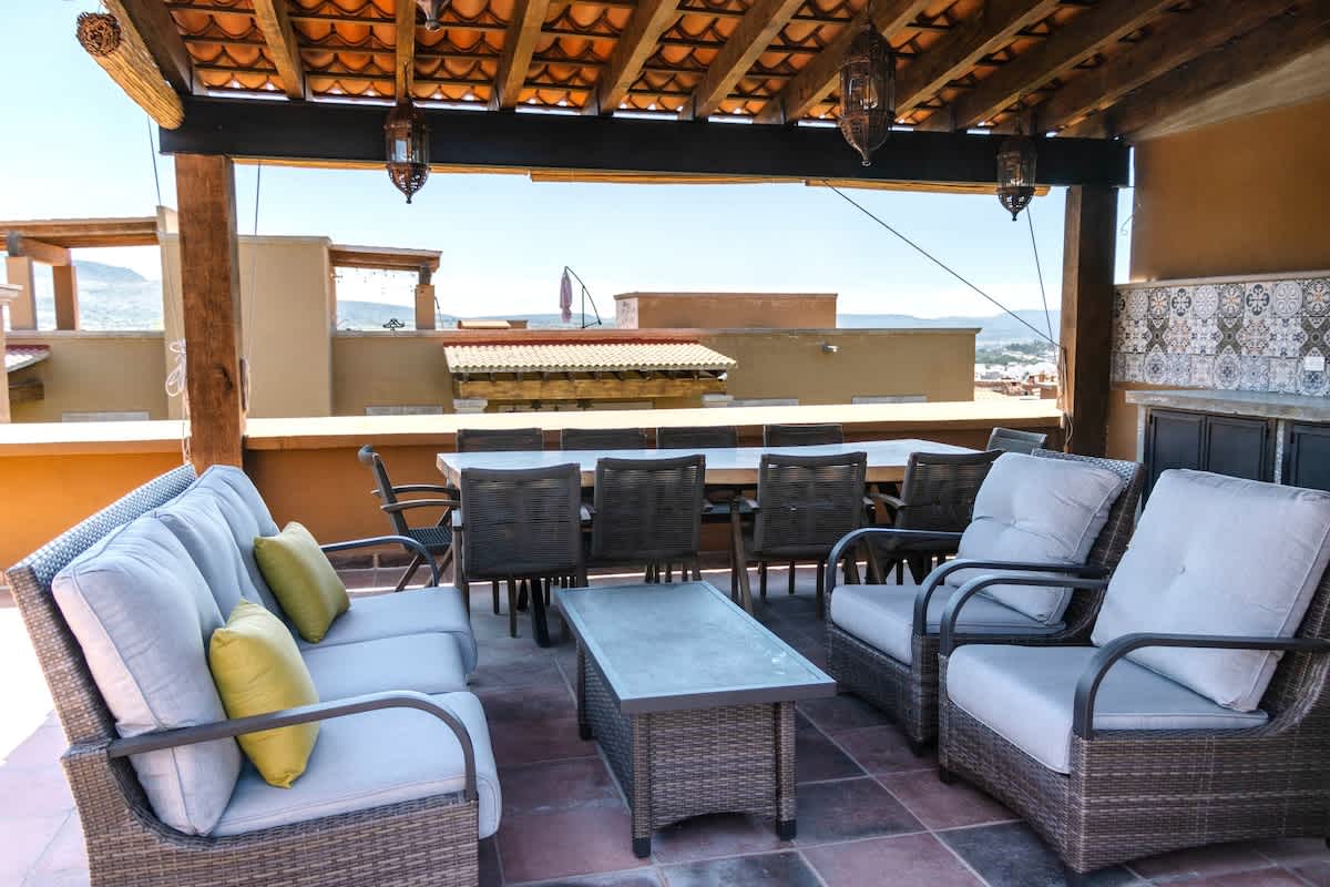 The tallest patio in the entire neighborhood - Casa de las Nuebes (house in the clouds) will not disappoint! A perfect couple’s retreat or 2 friends. This beautiful interior designer owned studio has all the magical qualities that visitors love about San Miguel. Walk just a few minutes from Centro to a gated 6 unit condo unit that is very safe and away from the downtown noise. Enjoy the stunning 360 view of morning hot air balloons, sunsets and all of SMA!