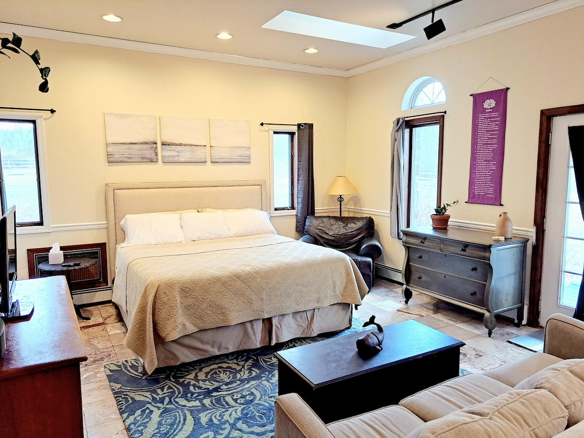 Minutes away from Lambertville & New Hope, enjoy the tranquility & beauty of a true farm experience as nature surrounds you! At Fiddlehead Farm, your guest suite has a private entrance through sliding glass doors that cover two entire walls. Plenty of natural light. Spectacular views of our fields and barn. This spacious "studio" apt has 12 foot ceilings, a wood burning fireplace, & kitchenette w/eating area. Plenty of space to rest, relax, read, eat, work, or just take in the amazing scenery.