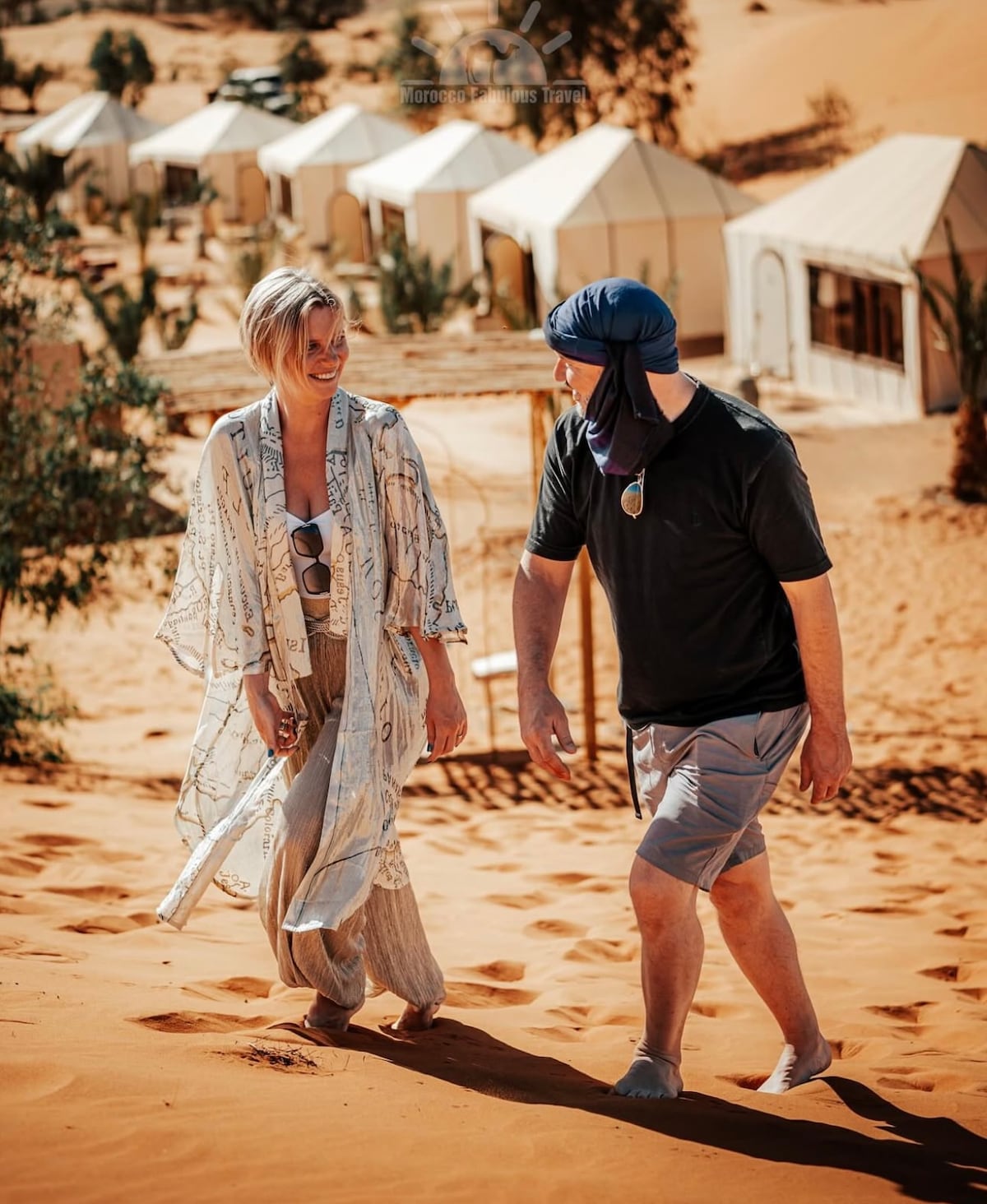 At our luxury camp, you can immerse yourself in the beauty of the desert while experiencing camel riding in the dunes and watching the sunset over the Erg Chebbi Dunes. Each tent is equipped with a comfortable bed, private bathroom, and shower. After a delicious dinner at the camp, you can relax under the starry sky and enjoy some Berber music around the campfire. Don't miss the chance to witness the stunning sunrise at the camp.