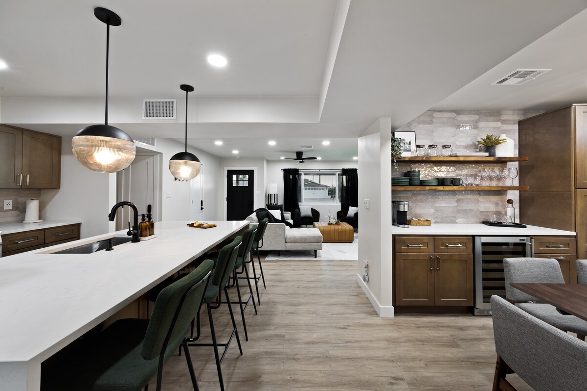 Discover your stylish oasis in South Scottsdale, moments from Old Town. This 4-bedroom w/ 7 beds retreat features all new furniture, TVs in every room, pool table, arcade game, and memory foam mattresses. The fully remodeled house offers a dazzling sunset mural as you walk out to the spacious backyard for games, BBQ, hammock, outdoor dining table, plenty of seating and a beautiful diving pool with electric heater (inquire for more info). Have the ultimate time at this relaxing retreat!