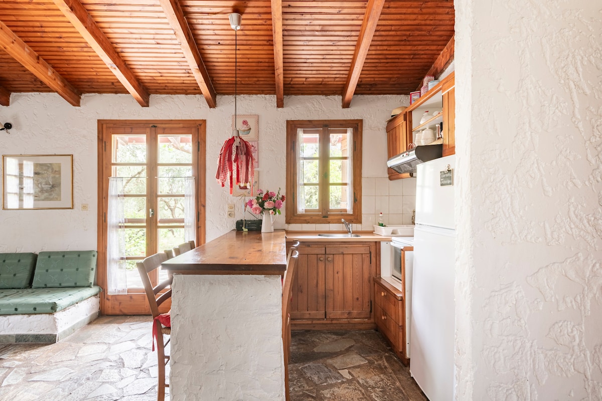 The house Thomais is in a quiet location, at the end of the village Korifasio, with a panoramic view of the bay of Navarino and the harbor town Pylos.So you have absolute privacy and quiet.The House offers a kitchenette with all necessary kitchen utensils, a double bed (on request, another bed available), wardrobe, air conditioning, TV, fly screen on all windows and one bathroom. On the large covered terrace there is an outside kitchen,outdoor shower, dining area, hammock as well as deckchairs.