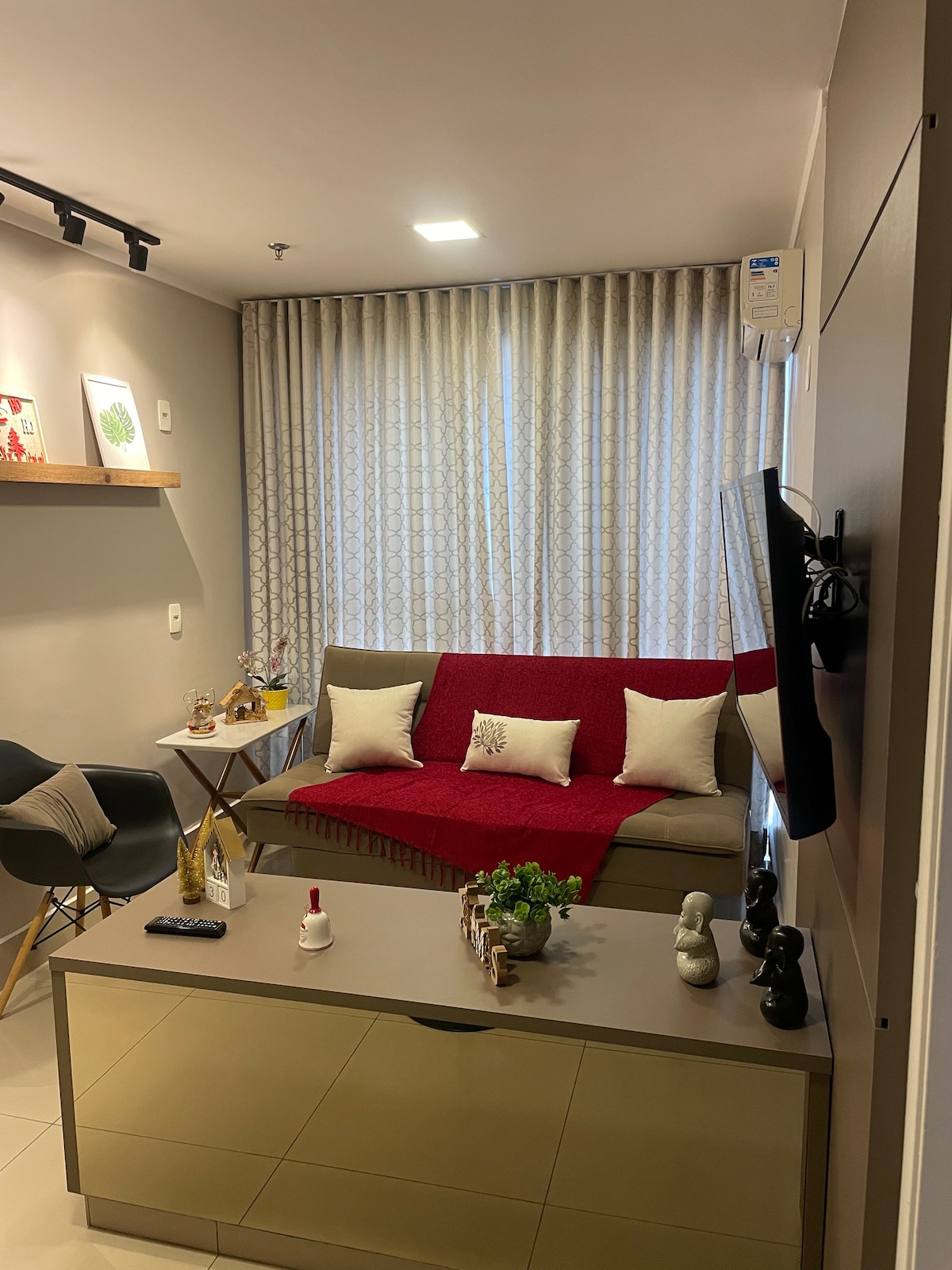 The Flat's architecture was designed by one of the most renowned professionals in Goiânia. The idea is for you to feel at home during your stay. Everything is automated; lights, curtains, TV, air-conditioning that offer comfort and refinement, just ask Alexa. Listen to music, watch more than 1,600 open and closed channels. Take a nice shower with a generous shower head. Take photos and relax on the balcony with a sensational sunset view and acrylic ceiling.