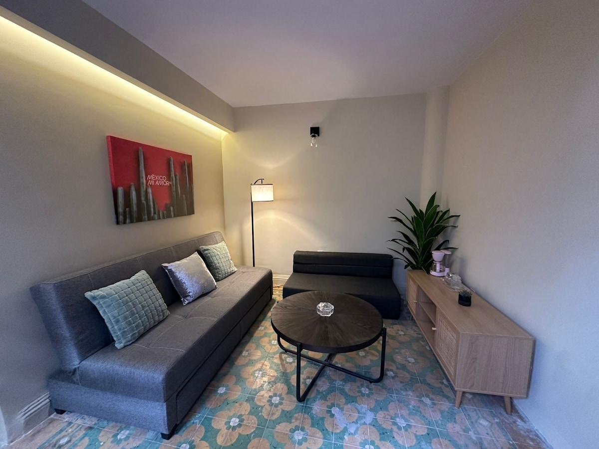 Well equipped lodge within historic distric, fully furnished, private parking with remote controled gate for vehicles up to 18 ft long and 7 ft high. Wi-Fi, smart TV on living room and main bedroom, one couch convertible into bed, air conditioned mini split type in all spaces, two balconies facing to the street, safe box, full kitchen, master berdroom with full size bed and secondary bedroom with two twin beds, hot water, self check-in equipped and all facilities to have a pleasant stay