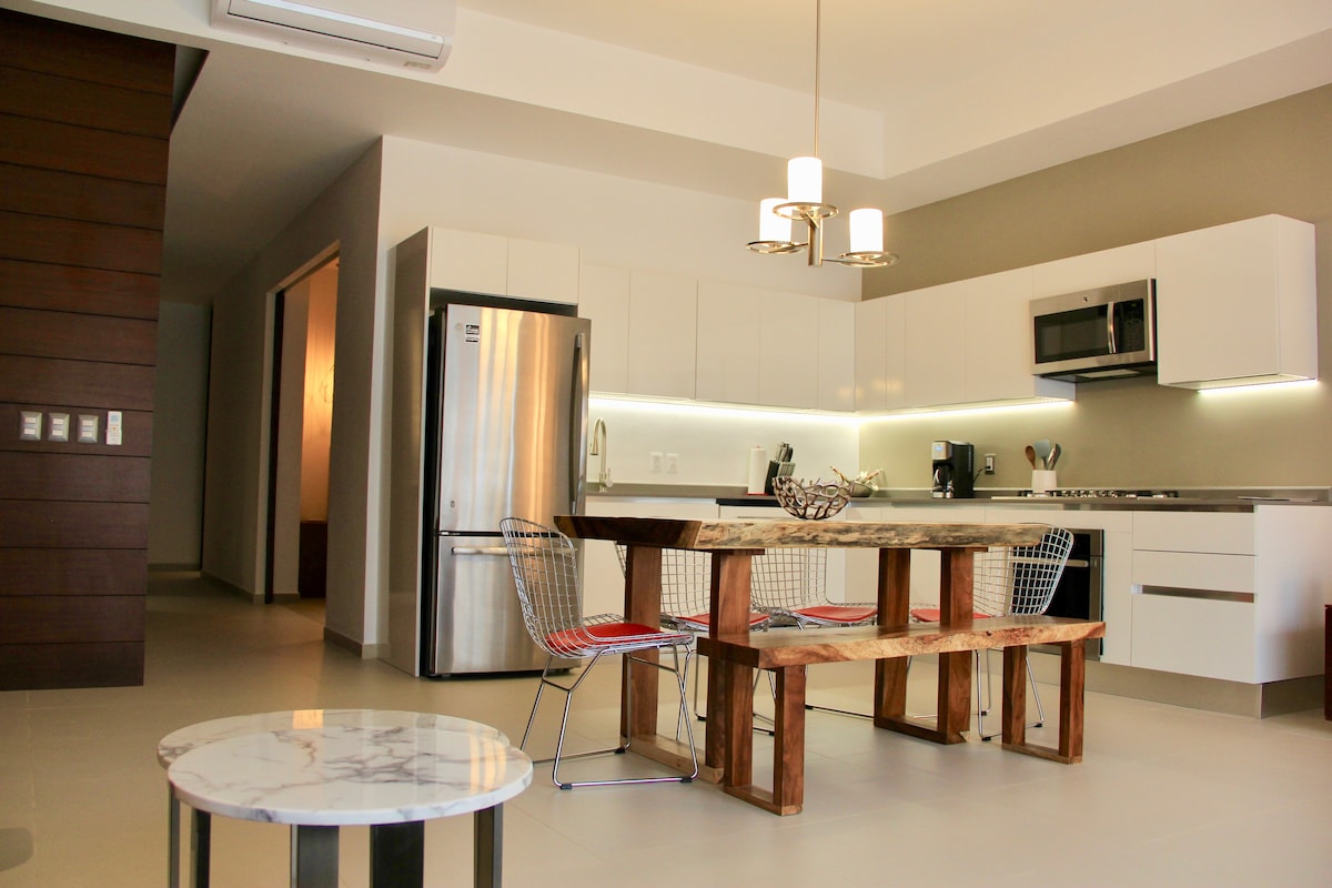 ***Pool/hotub closed Jun-Aug 2025.*** Designer 2 bedroom and 2 bath condo surrounded by restaurants, shopping, and nightlife. Just 3 blocks to the beach, cultural stage, and Malecon (ocean boardwalk). Our building has a private infinity pool, large hot tub, rooftop lounge, exercise gym, and 24-hr security. The fully equipped condo has everything you need to make yourself at home during your stay in Puerto Vallarta. Experience one of the most vibrant and diverse neighborhoods in Mexico.