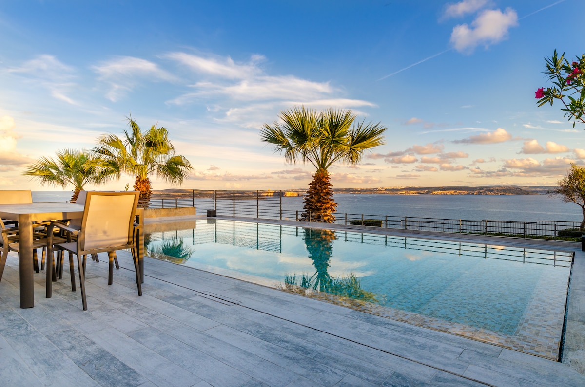 Escape to the serene beauty of Gozo in our contemporary villa built inside an 18th Century fortress which now serves as an exclusive gated community. Enjoy incredible Gozo Channel, Comino and Blue Lagoon sea views. Indulge in a private rooftop hot tub and outdoor dining on the poolside terrace, and take a dip in the private pool or extensive communal pools. The designer interior boasts 2 full kitchens, dishwasher, A/C, Smart TV, and WiFi. Perfectly situated, just a 2-minute drive from the ferry.