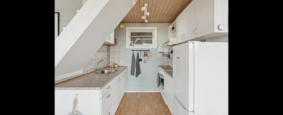 Cozy little cottage located close to the north coast of Funen. Good undisturbed terrace. View of nature area, 500m to child-friendly beach. The house is 32 m2, with a kitchen-living room and a small bathroom with shower. The kitchen is well equipped with oven, refrigerator, etc. Dining area with the possibility of a dining area for 6-8 people. Bedroom with 140 cm wide bed. The house is heated with a heat pump, electric radiator, solar-venti or wood-burning stove. Middelfart offers experiences such as: beautiful nature bridgewalking, claymuseum and Hindsgavl Castle