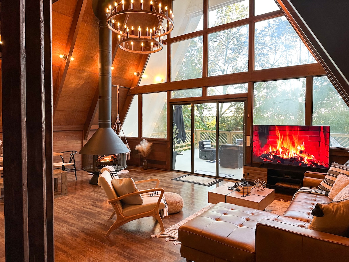 This is a three floors gorgeous A FRAME HOUSE designed for anybody who loves nature, luxury homes, and privacy, with an amazing interior design cozy and modern. Is a private space for friends and families. During your visit you will have work space, pool, hot tub, pool table, game room, tv room, outdoor fire pit, indoor fireplace, back porch with an amazing view, modern kitchen, and cozy corners all around the house, It’s the perfect vacation rental home that you will never want to leave!