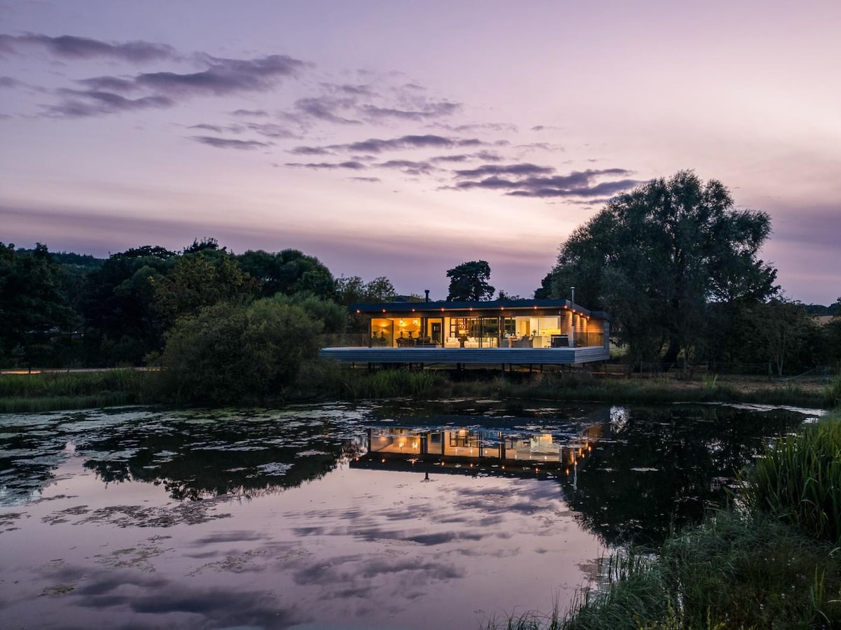 Restatthenest. This exquisite waterside lodge is beautifully decorated throughout with superior comfort and design to offer couples a secluded, luxury getaway. With its large open plan living and super king size bedroom, private decking and hot tub Kingfisher offers the ultimate romantic escape. Features • Super king bed • Fully equipped kitchen • Suspended log burner • Inbuilt music system • Smart TV • Ensuite with rain shower and double sink • Private hot tub • Underfloor heating