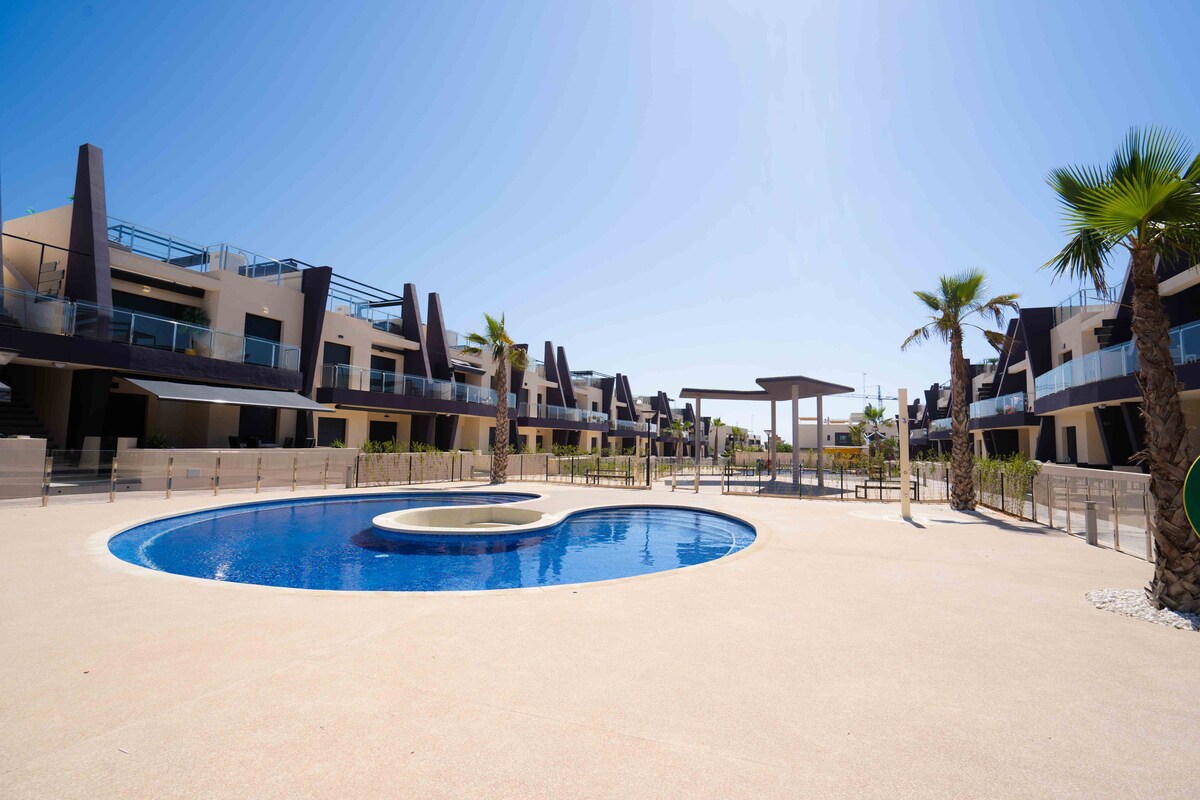 Enjoy the ultimate getaway just 300 m from the sea! This stylish 2-bedroom apartment offers modern comfort, a fully equipped kitchen, and bright, inviting spaces. Step outside to a huge private terrace with a BBQ – perfect for unforgettable evenings – and a large shared pool to cool off or soak up the sun. Located in peaceful Pilar de la Horadada, close to beaches, restaurants, and bike paths. Sun, sea, and serenity await!