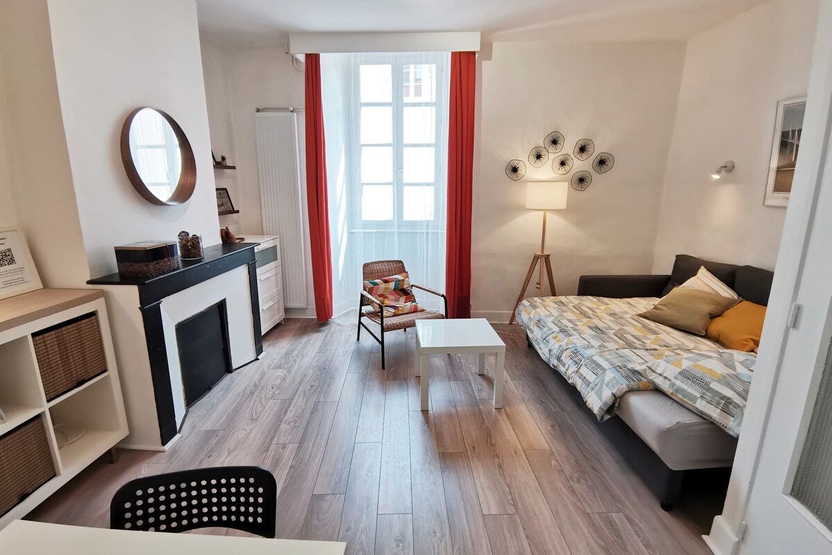 The 40 m² apartment is located in a quiet small pedestrian street near Place Foch. The accommodation is on the first floor. It includes a kitchen and lounge area with sofa, a bathroom (shower and WC) a bedroom with a double bed. The entrance is independent. Shared places: we live next door but make available during the stay the small courtyard with garden table and chairs, as well as a laundry room with washing machine and for bicycles or other.