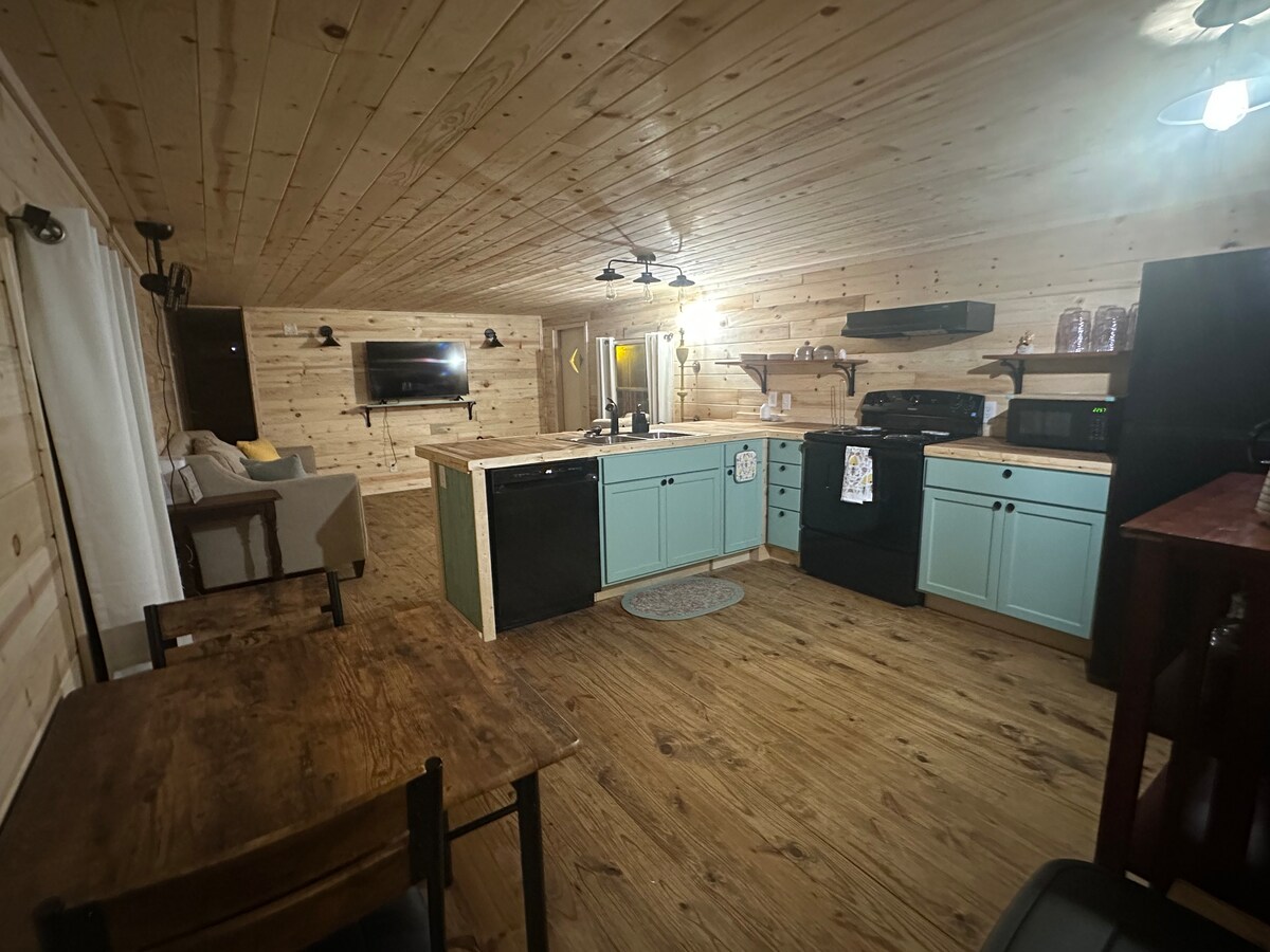 Our small cozy cabin, newly built in 2021, is stocked with all the essentials you'll need for your home away from home. We offer 1 bedroom and 1 loft, a fully equipped kitchen, free wifi, washer and dryer, a peaceful front porch, and a TV with access to Netflix, Disney+, ESPN+, Hulu, and more. We offer the best of town and country -- we are located in city limits for quick access to shops and restaurants, and other than our personal residence on the property, there are no neighbors in sight.