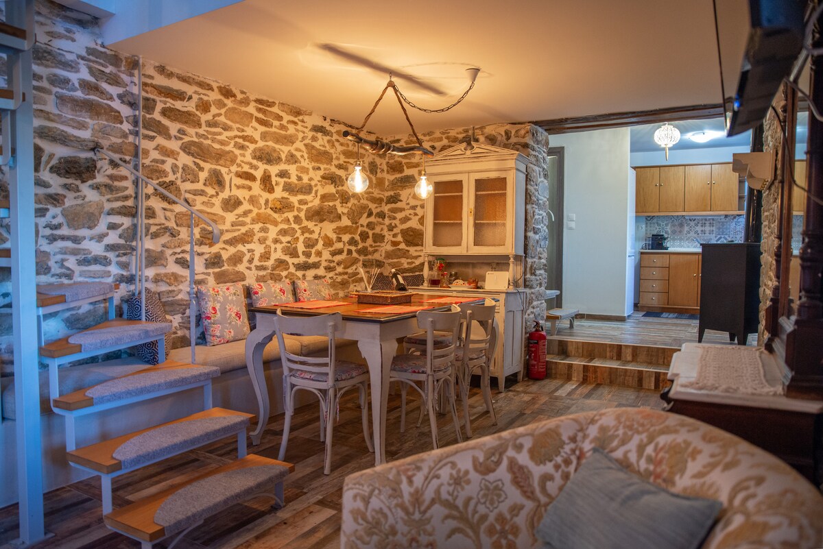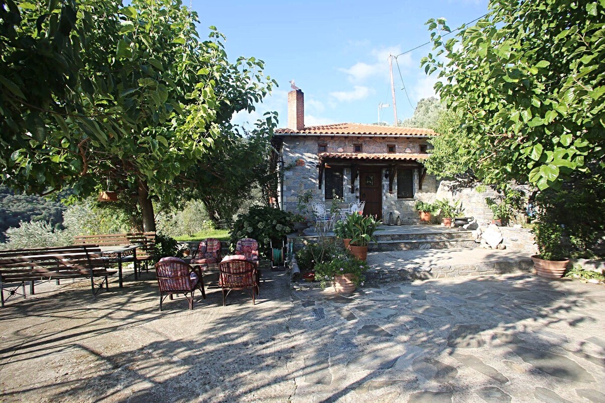 A country stone house gives you the opportunity of privacy and relaxation. Surrounded by olive trees and a breathtaking view of Aegean sea. Petit Stonehouse is five minutes drive from Mulopotanos Beach and five mins from Tsagarada village. Also available BBQ-Air cooler - fireplace-Tv-Hot water