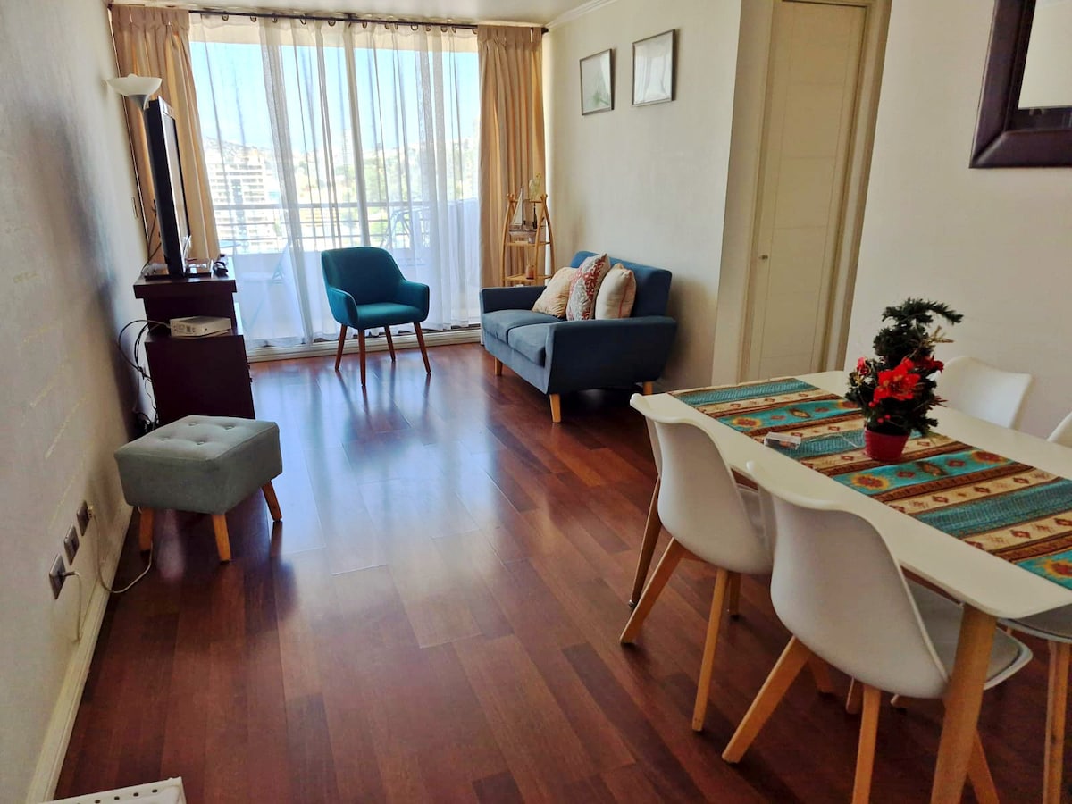 Enjoy the beautiful city of Viña del Mar in a simple, cozy, quiet and central apartment located in Miramar metro, where you can walk to the Flower Clock, Caleta Abarca beach, Quinta Vergara, Plaza de Viña and Casino de Viña, downtown is one block away, a supermarket nearby and transportation to the door. The apartment has the basics so you can rest. It is suitable for 1 to 4 people. Includes parking The building has a laundry for a fee.