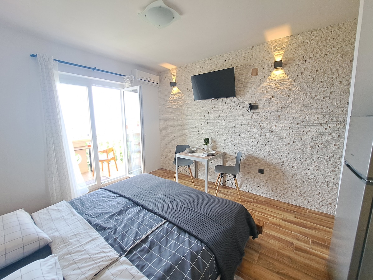 **New stone apartment near the sea with fantastic sea view**. Apartment 55m2 for 2 + 1guests . Spacious living room with sofa that becomes a double bed (smart TV, air conditioning)Kitchen (oven, dishwasher, coffee machine). 1. Bedroom (large double bed, wide wardrobe) with toilet (shower). The apartment has a private terrace (10m2) with amazing sea views. The terrace contains a table for 4 people.