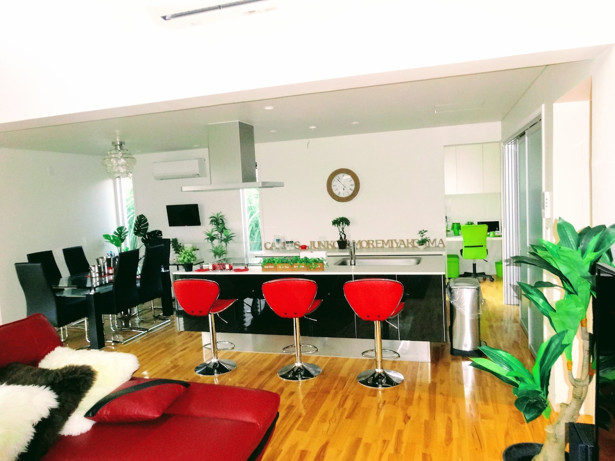 ~ Relax and enjoy a luxurious time in a luxury suite ~ This is a newly built detached house that opened in September 2024. The white-toned interior is clean, and you can relax in the spacious 3LDK space of about 100 square meters. There are 3 bedrooms. We are also particular about home appliances, and welcome you with luxurious amenities such as BALMUDA and ReFa hair dryers that are gentle on your hair. We also have a shaved ice machine, so why not come back after playing outside and cool off by eating shaved ice together? One of the charms is the easy location, with the largest downtown area, Sesoko-dori, and a supermarket convenient for shopping just a 5-minute drive away. Why not spend a relaxing and luxurious time at Miyako Beach Resort? There is a crib for children - WiFi is available. 2 parking spaces 2 dressing tables Fully equipped with water softeners Internet TV (you'll need to log in to your own account) Life jackets available for rent (reservation required) ※ Handheld fireworks only allowed ※ The neighborhood is currently under construction