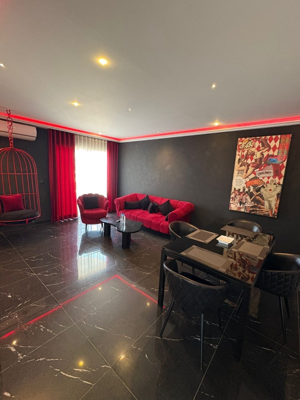 REDSTYLE – Appartement S+2 meublé à Cité Les Oasis, Tunis. Profitez d’un espace moderne et lumineux avec salon, cuisine équipée, deux chambres climatisées, salle de bain avec jacuzzi. Résidence sécurisée 24h/24 avec parking et restaurant. Wi-Fi, chauffage central et ascenseur disponibles. À 5 min de l’aéroport et proche des cliniques et restaurants.