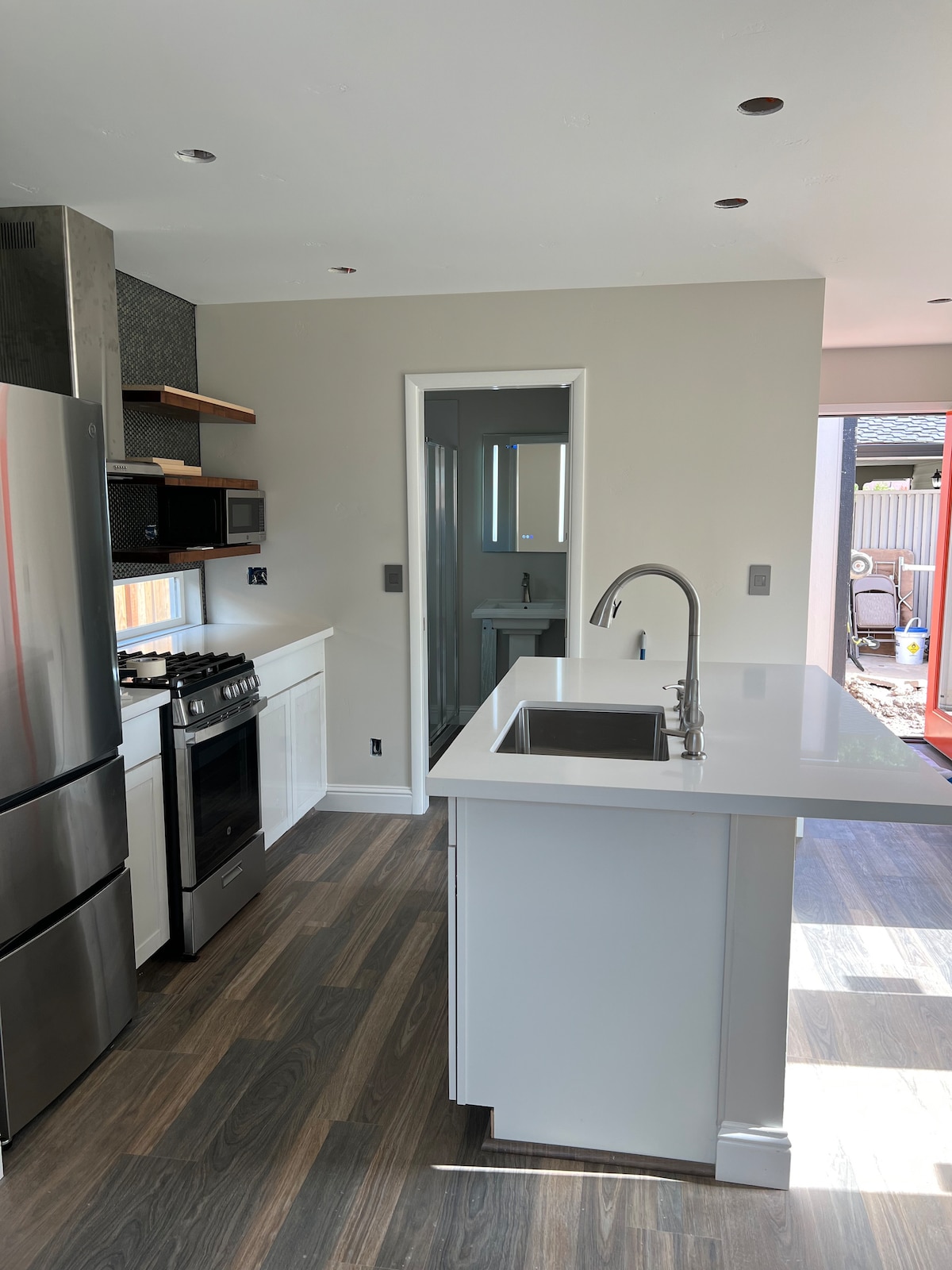 Bright, open-concept studio offers everything you need for a seamless stay: Plush Queen-size bed, a full kitchen featuring granite countertops, a full-sized range, and microwave. Modern bathroom with a spacious walk-in shower. Comfortable sofa seating, a flat-screen TV, and high-speed Wi-Fi. Private Entrance & Patio In-Unit Laundry: Full-sized washer and dryer. Quiet, powerful mini-split AC system. Easy Parking: Dedicated space in a safe, quiet residential area.
