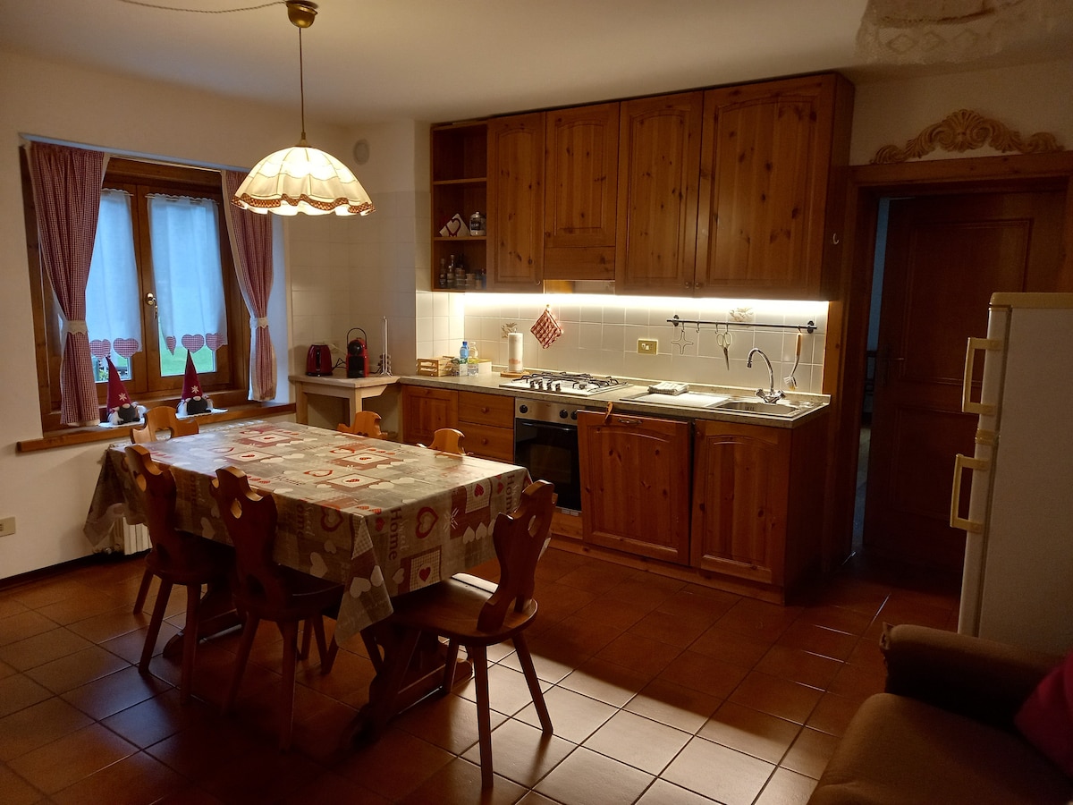 80 sqm apartment in the heart of the Dolomites, 24 km from Cortina d 'Ampezzo and an hour and 50 from Venice. The apartment consists of 2 bedrooms (one with a double bed and one with two single beds), an open space consisting of living room, kitchen and dining room, a bathroom and a balcony (with indoor dining table). The apartment has free private parking.