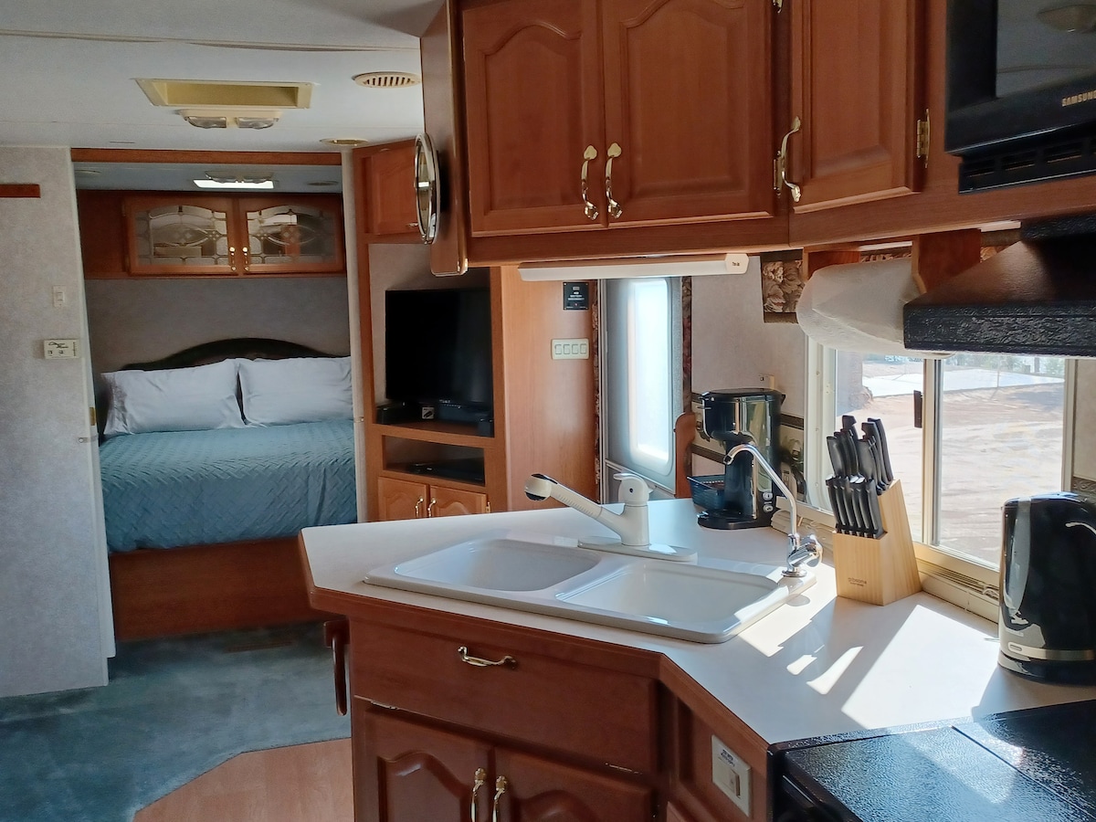 Experience the rural setting of our Country Chateau RV in the Desert of Scenic Arizona in this cozy 1-bedroom recreational vehicle. The queen bed ensures a peaceful night's sleep for guests in a private bedroom. With a living room featuring a converted table bed and a sofa bed. There's plenty of awesome space to relax. Heating and AC keep you comfortable year-round, while the bathroom with a shower provides all the essentials. It's easy to see why you'll be able to unwind at our RV.