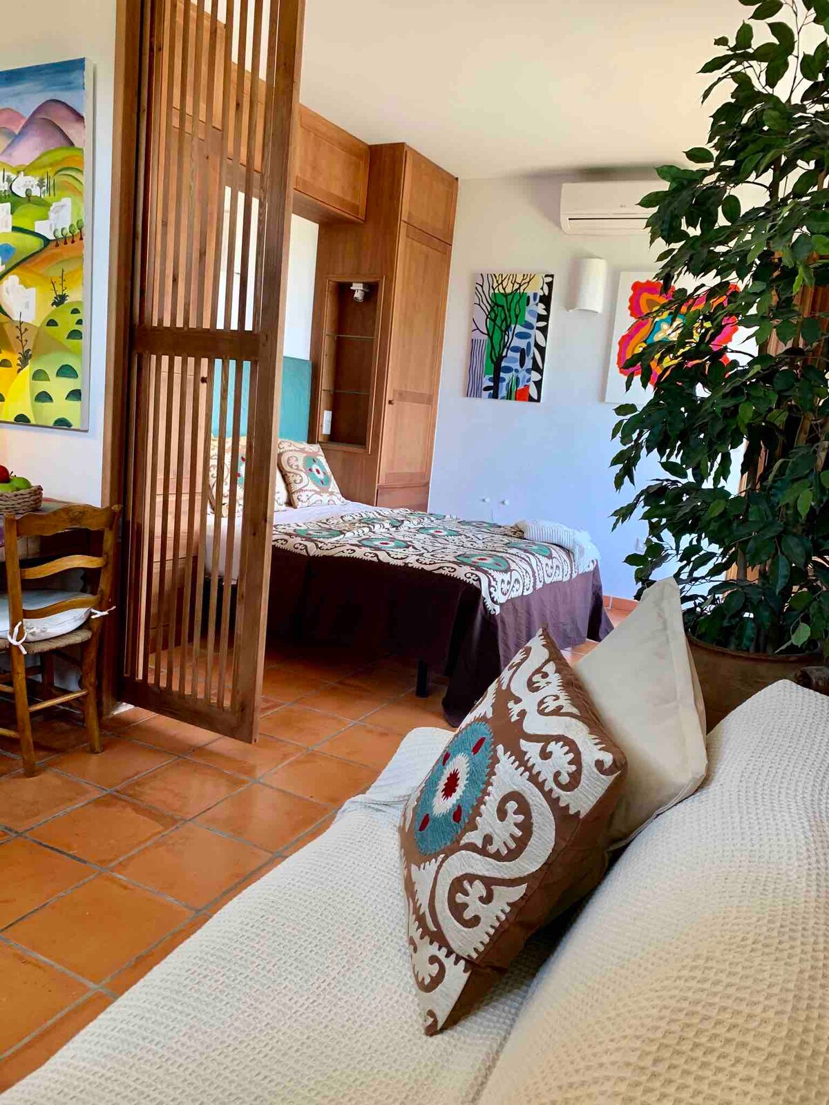 This spacious one bed-roomed apartment has been created from an annexe of an old cortijo.Fully furnished with private entrance and off road parking..The kitchen is well equipped with all you need and even for picnics ! There are 2 private areas to the rear to sit and have a coffee or a bite to eat. From the private parking to the access of the whole apartment it is all on one level In the colder months there is a goose down duvet and electric blankets,aircon heating and a gas fire.