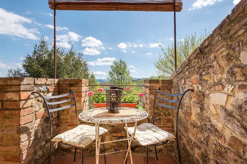 Charming cottage in the heart of Tuscany on a peaceful property surrounded by 5 hectares of private gardens and forest. The apartment has stunning views over San Gimignano and the Chianti Hills. One of the two bedrooms has air conditioning.