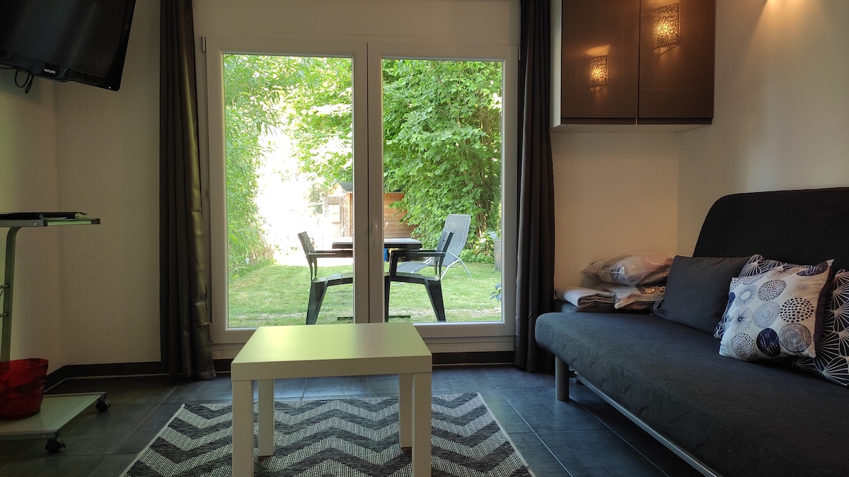 BEAUTIFUL 36 M2 studio, close to the city center. The accommodation is on the ground floor, quiet in an inner courtyard, with a private covered terrace in high season. It can accommodate 2–3 guests as the sofa converts to a single bed. New 160 × 200 bedding from 2024. Parking space (4.4 m maximum length) in the inner courtyard. Closed bike storage upon request. Strasbourg is 25 minutes by car or train. A train stop is located in front of Strasbourg airport.